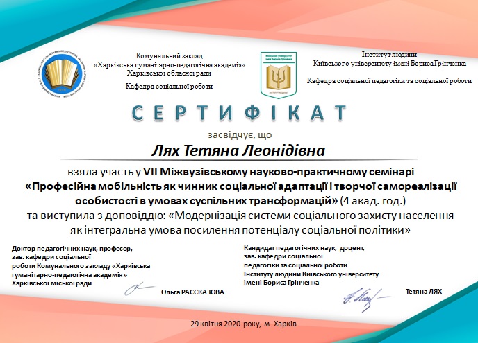 | 1127 | Факультет психології, соціальної роботи та спеціальної освіти | Кафедра соціальної педагогіки та соціальної роботи | 390.5 | 6 | 2024 | https://www.researchgate.net/profile/Tetiana-Liakh/stats |