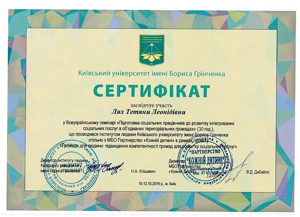 | 5411 | Всеукраїнський семінар «Підготовка соціальних працівників до розвитку інтегрованих соціальних послуг в об`єднаних територіальних громадах» в межах проекту «Громада для людини: підвищення компетентності громад для розвитку соціальних послуг», що реалізується Міжнародною благодійною організацією «Партнерство “Кожній дитині”» за підтримки Програми «U-LEAD з Європою» і фінансування Європейським Союзом та його країнами-членами (Данією, Естонією, Німеччиною, Польщею та Швецією) | модератор | Київ, Київський університет імені Бориса Грінченка |