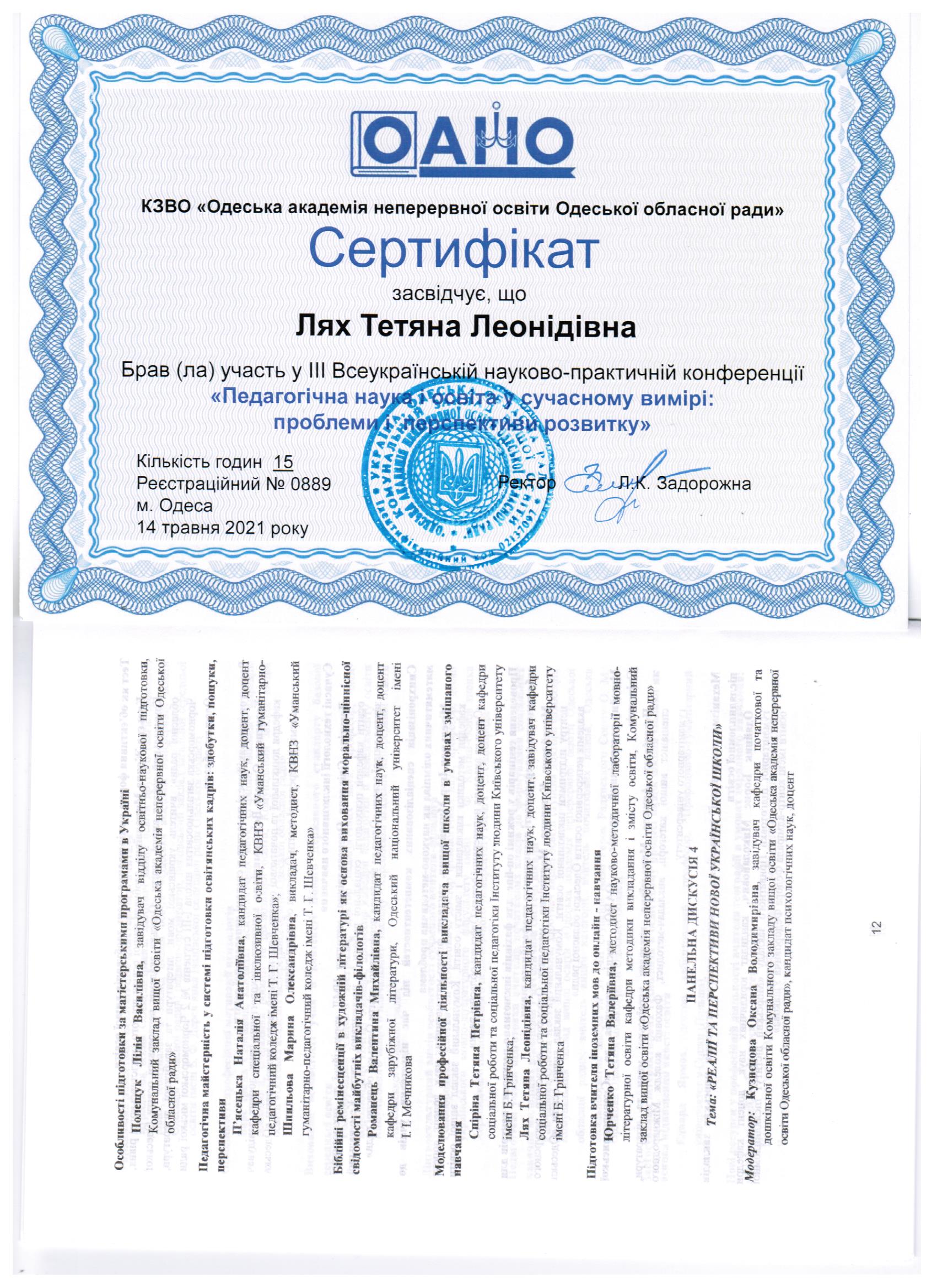| 6852 | ІІ Всеукраїнська науково-практична конференція "Педагогічна наука і освіта у сучасному вимірі: проблеми і перспективи розвитку" | Моделювання професійної діяльності викладача вищої школи в умовах змішаного навчання | м. Одеса, ДВНЗ "Одеська академія неперервної освіти Одеської обласної ради" |