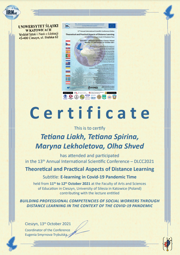 | 8317 | "Theoretical and Practical Aspects of Distance Learning”, Subtitle “E-learning in the Transformation of Education in Digital Society” (DLCC2022 conference) | Analysis Of The Needs Of Social Workers Regarding Their Utilization Of ICT in the System of Provision Of Social Services (Kyiv City, Ukraine) | Cieszyn, Poland |