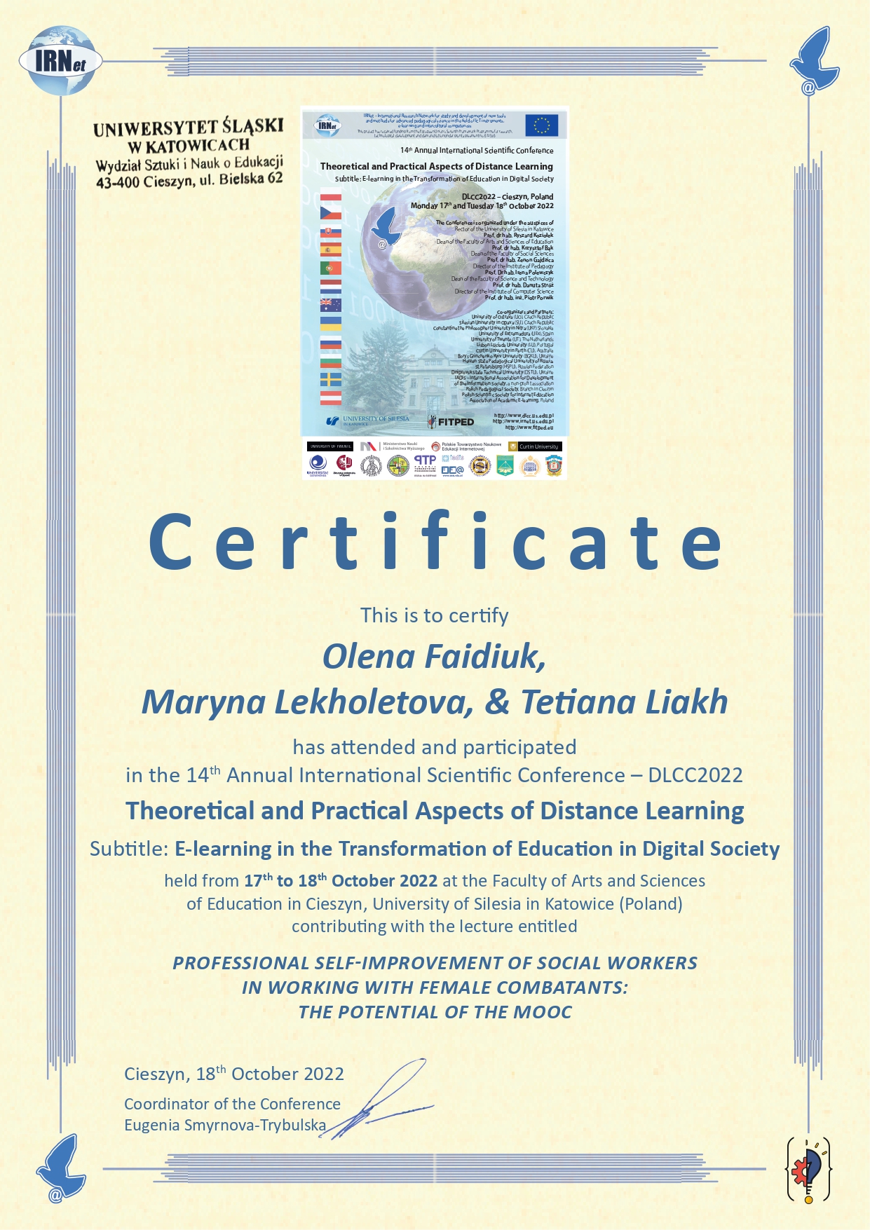 | 8318 | "Theoretical and Practical Aspects of Distance Learning”, Subtitle “E-learning in the Transformation of Education in Digital Society” (DLCC2022 conference) | Professional Self-Improvement of Social Workers in Working with Female Combatants: the Potential of the МООС | Cieszyn, Poland |