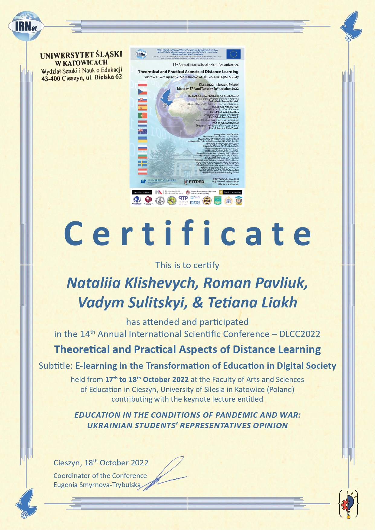 | 8320 | "Theoretical and Practical Aspects of Distance Learning”, Subtitle “E-learning in the Transformation of Education in Digital Society” (DLCC2022 conference) | Education in the Conditions of Pandemic and War: Ukrainian Students’ Representatives Opinion | Cieszyn, Poland |