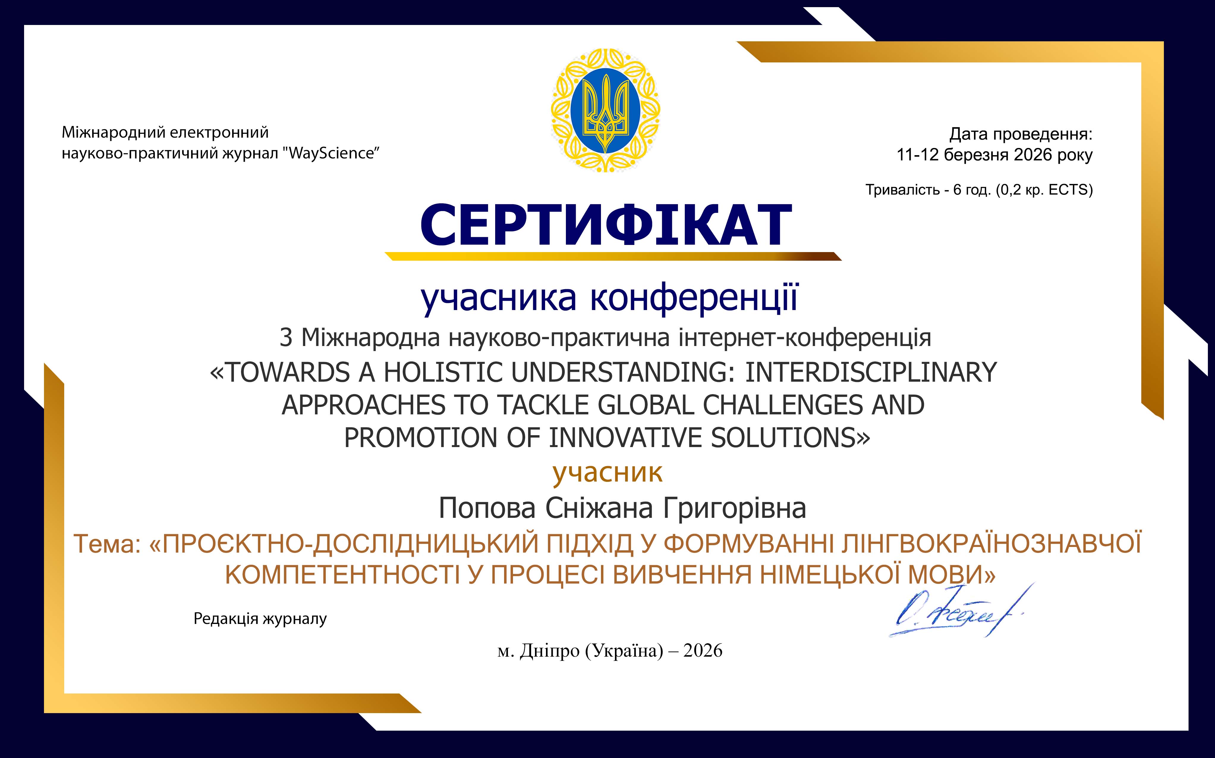 | 13177 | TOWARDS A HOLISTIC UNDERSTANDING: INTERDISCIPLINARY APPROACHES TO TACKLE GLOBALCHALLENGES AND PROMOTION OF INNOVATIVE SOLUTIONS | Проєктно-дослідницький підхід у формуванні лінгвокраїнознавчої компетенції у процесі вивчення німецької мови | м.Дніпро, Україна |