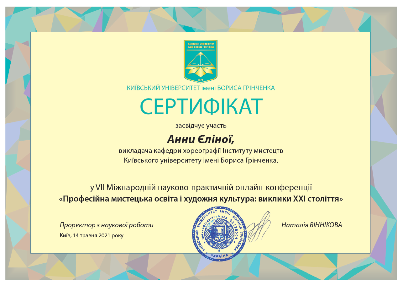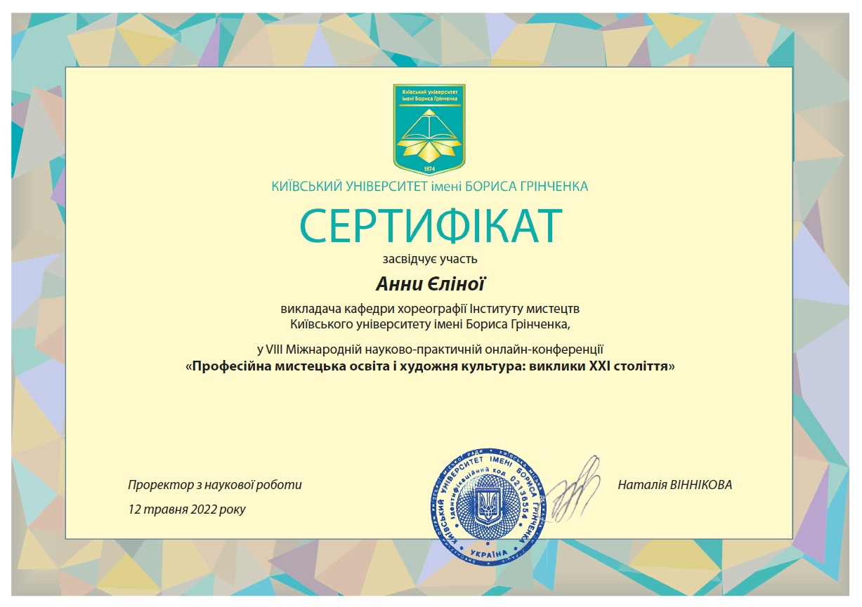 р. – Київський університет імені Бориса Грінченка, кваліфікація: балетмейстер, викладач