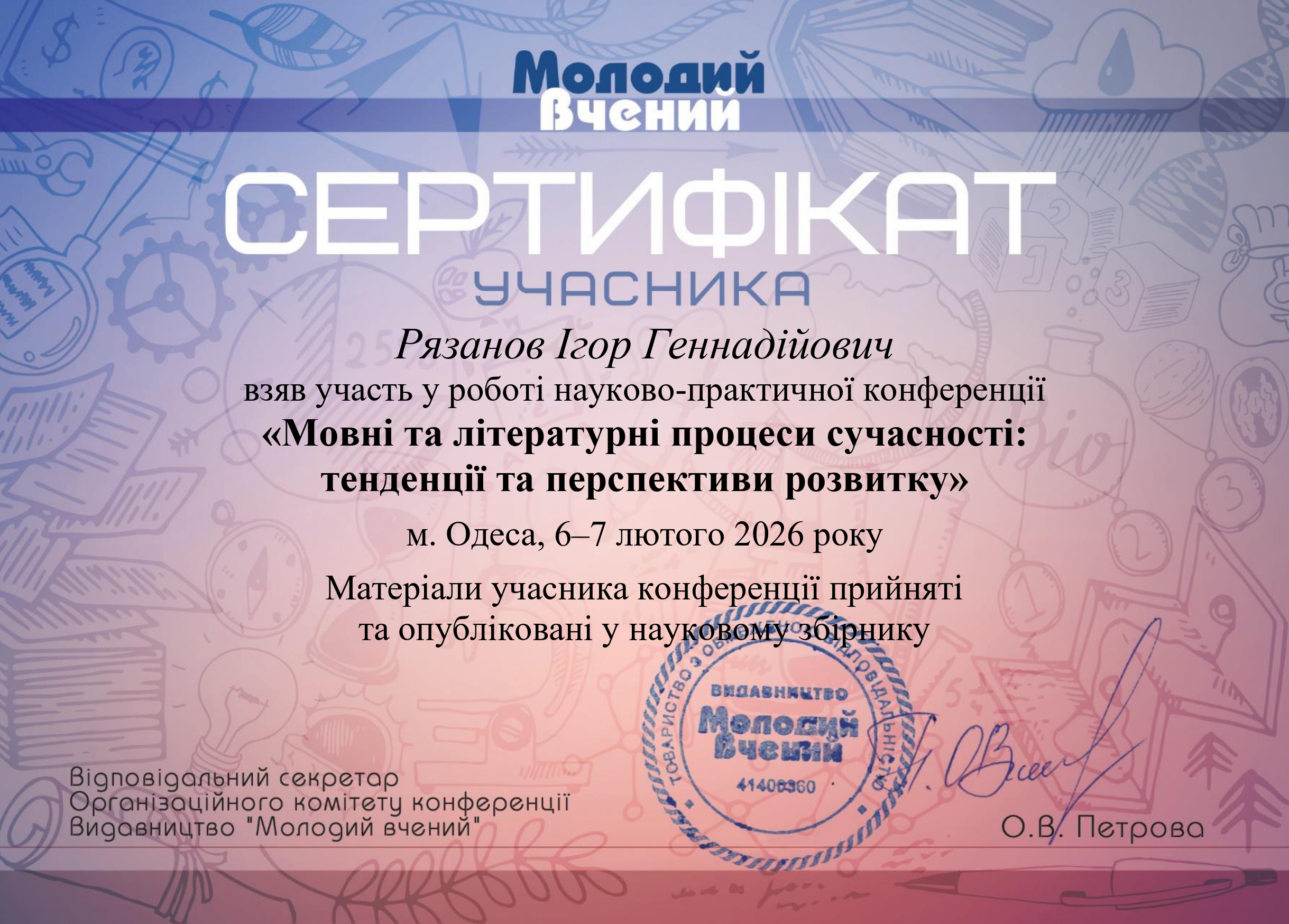 | 739 | Факультет романо-германської філології | Кафедра лінгвістики та перекладу | 4 | 0 | 2025 | https://www.researchgate.net/profile/Ihor-Riazanov |