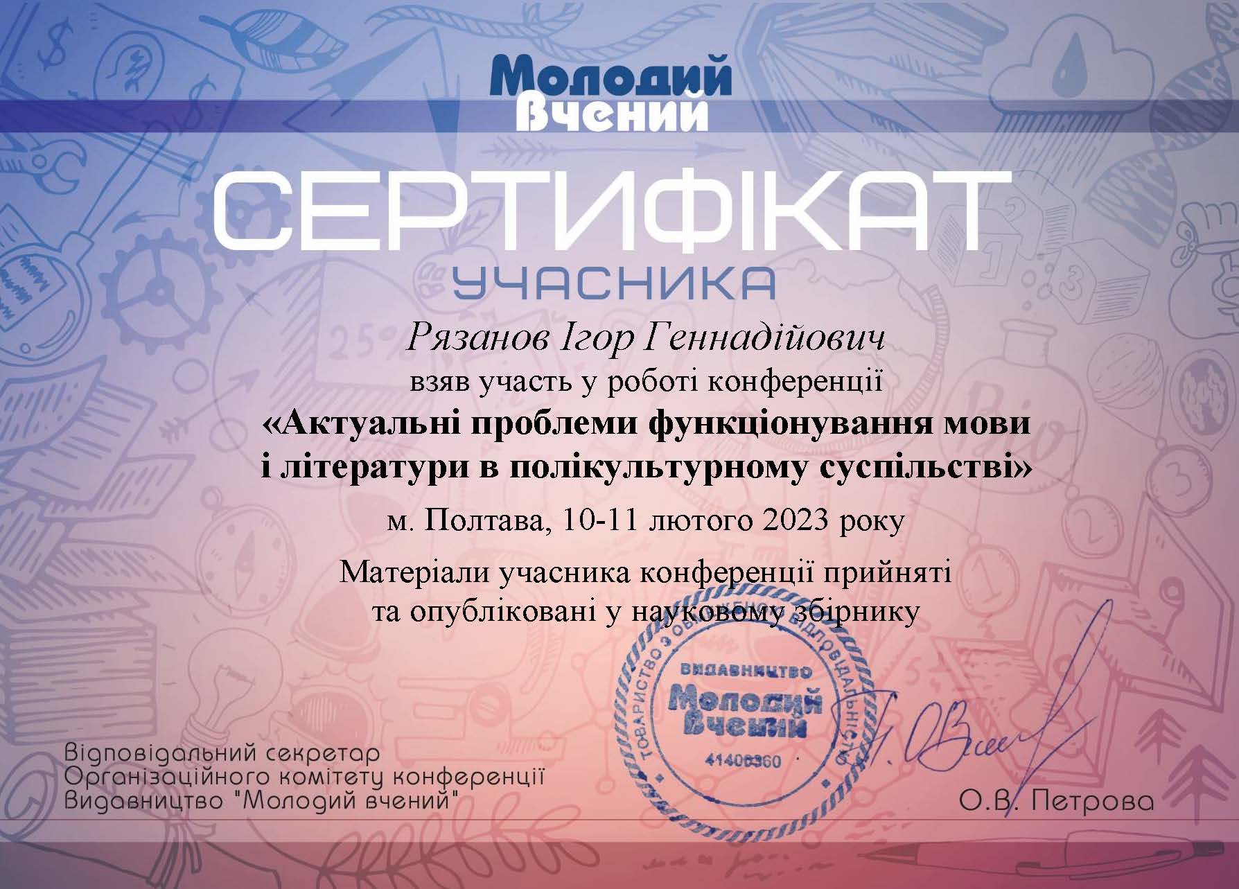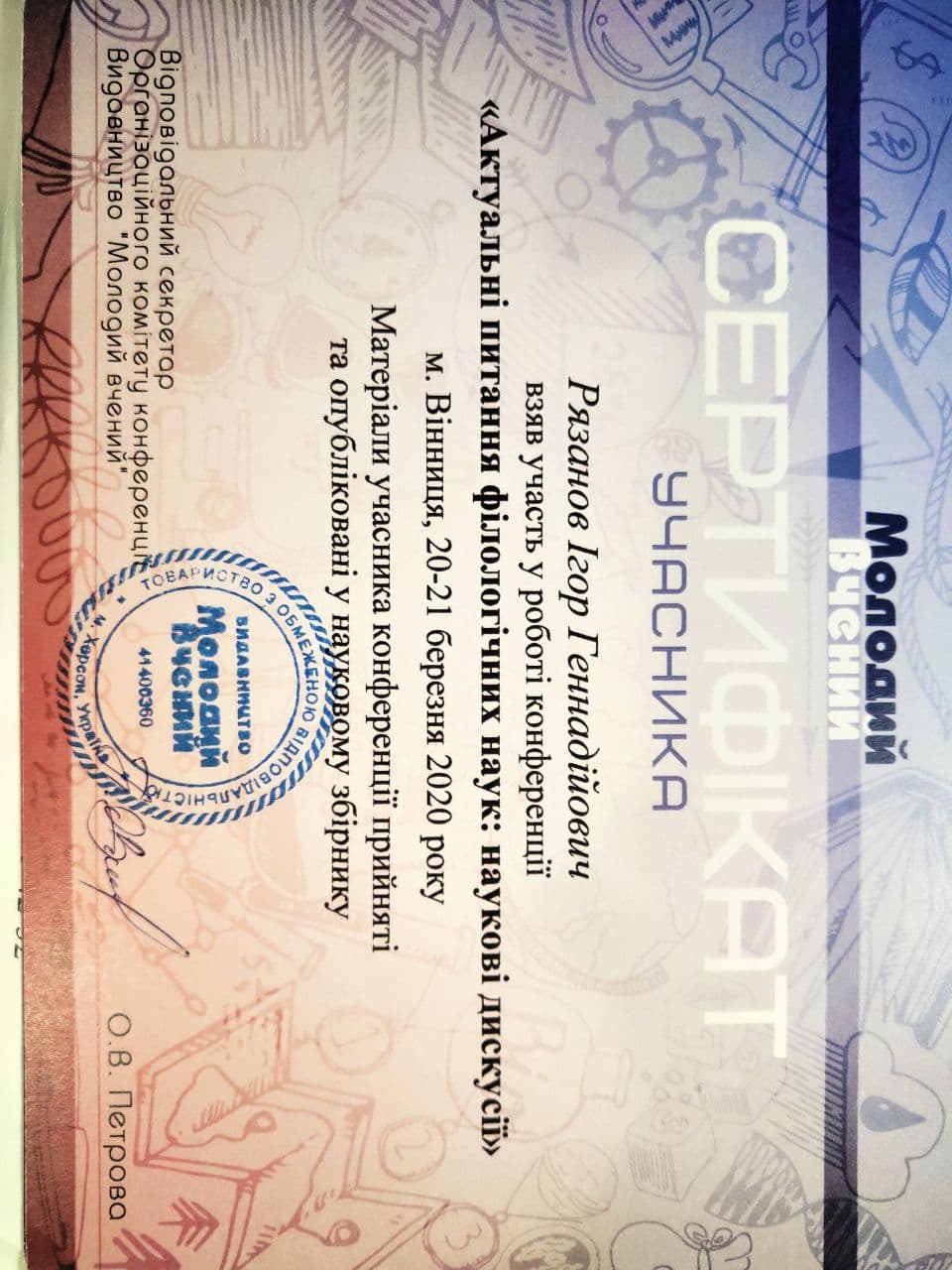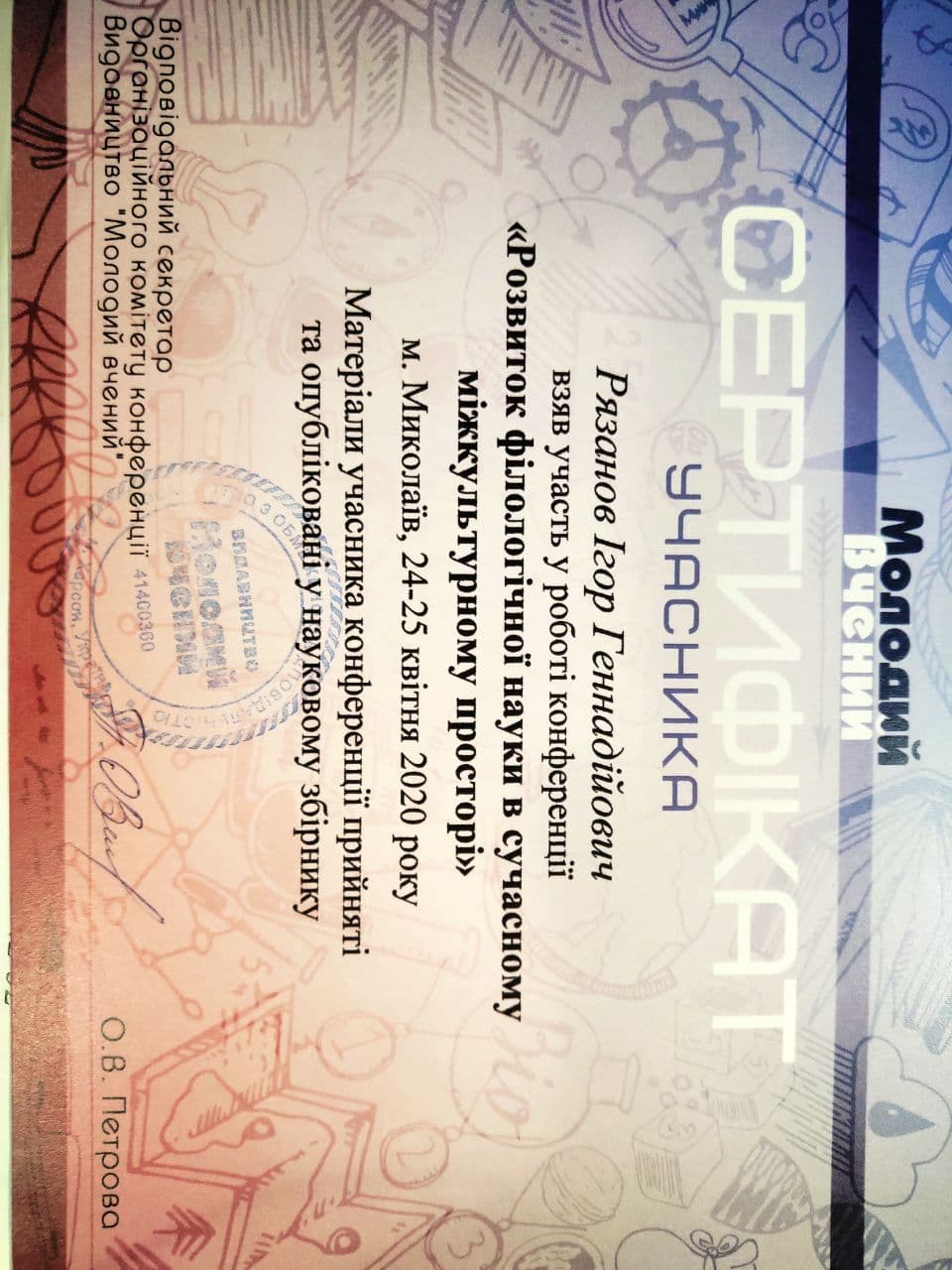 | 124 | Якуба Валентина Володимирівна, кандидат філологічних наук, доцент, декан Факультету романо-германської філології Київського столичного університету імені Бориса Грінченка. | «Структурні й стилістичні особливості пісенного тексту в американському репі» / спеціальність 035 Філологія | З вересня 2020 року і до серпня 2024 р. навчався в аспірантурі Університету Грінченка на освітньо-науковій програмі «Філологія» за спеціальністю 035 Філологія, галузь знань 03 Гуманітарні науки. | Київський столичний університет імені Бориса Грінченка | Диплом_Рязанов.PDF | 2024 |