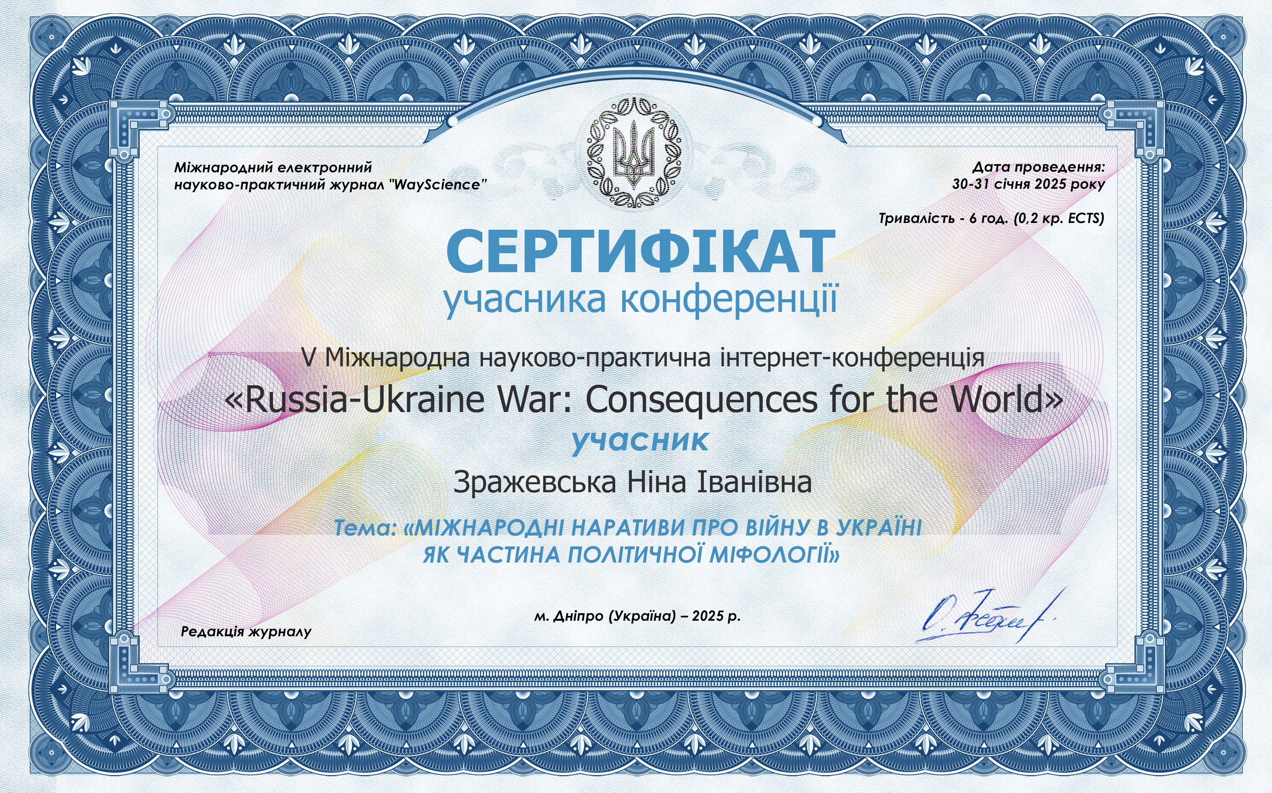 | 11764 | Актуальні проблеми медіапростору | МІФ “ПРО ЗМОВУ” В МІЖНАРОДНИХ МЕДІАНАРАТИВАХ В КОНТЕКСТІ ВІЙНИ РОСІЇ ПРОТИ УКРАЇНИ | Київський університет Імені Тараса Шевченка |