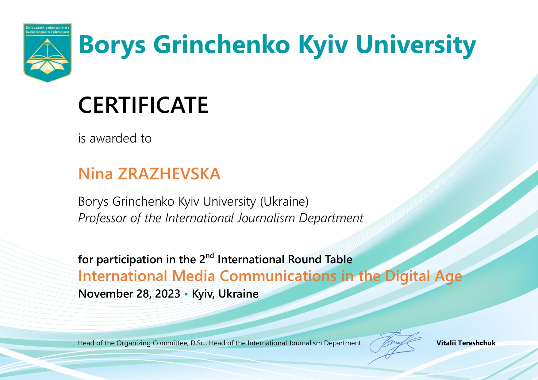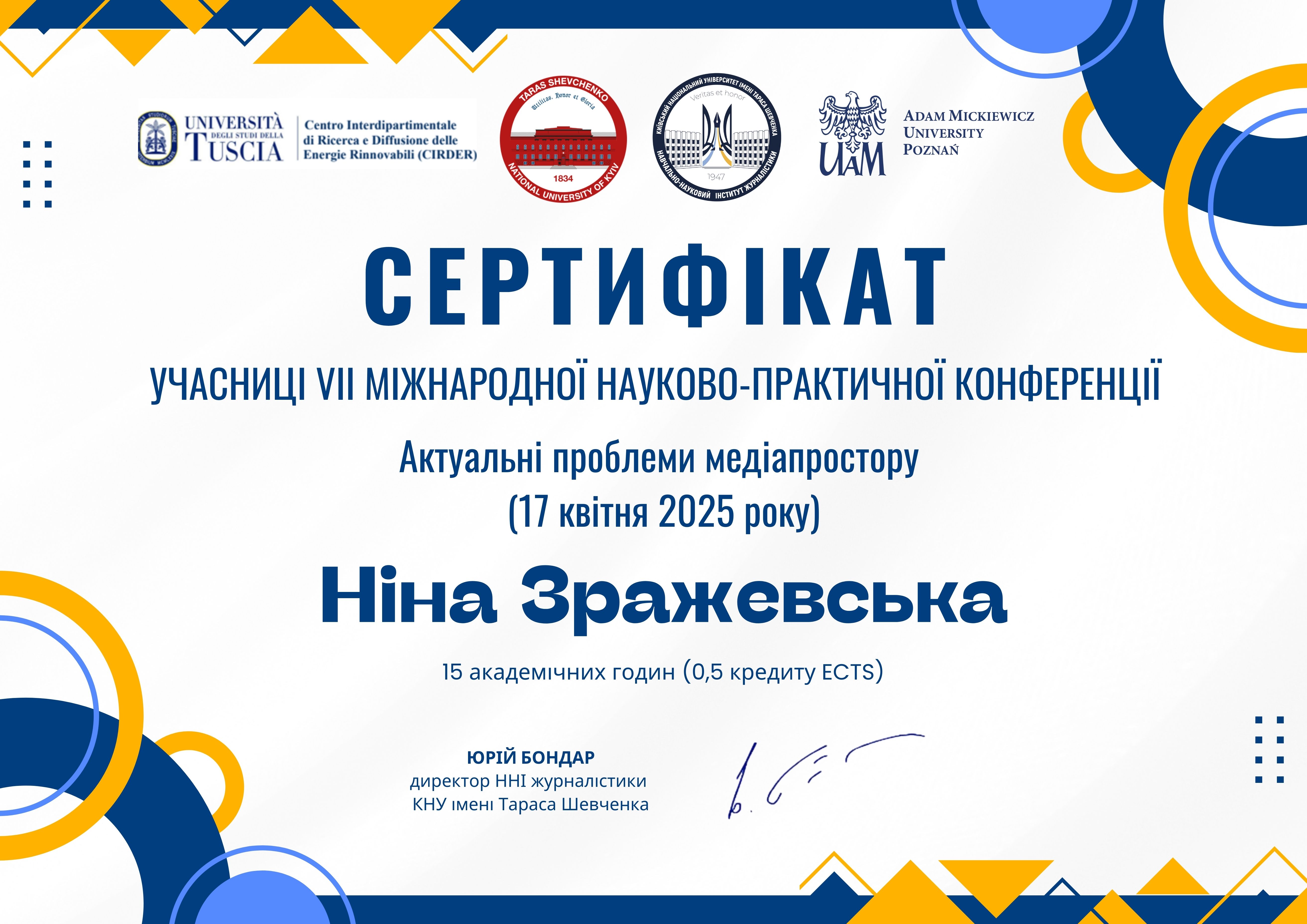 | 720 | Факультет журналістики | Кафедра міжнародної журналістики | 42.8 | 3 | 2025 | https://www.researchgate.net/profile/Nina-Zrazhevska |