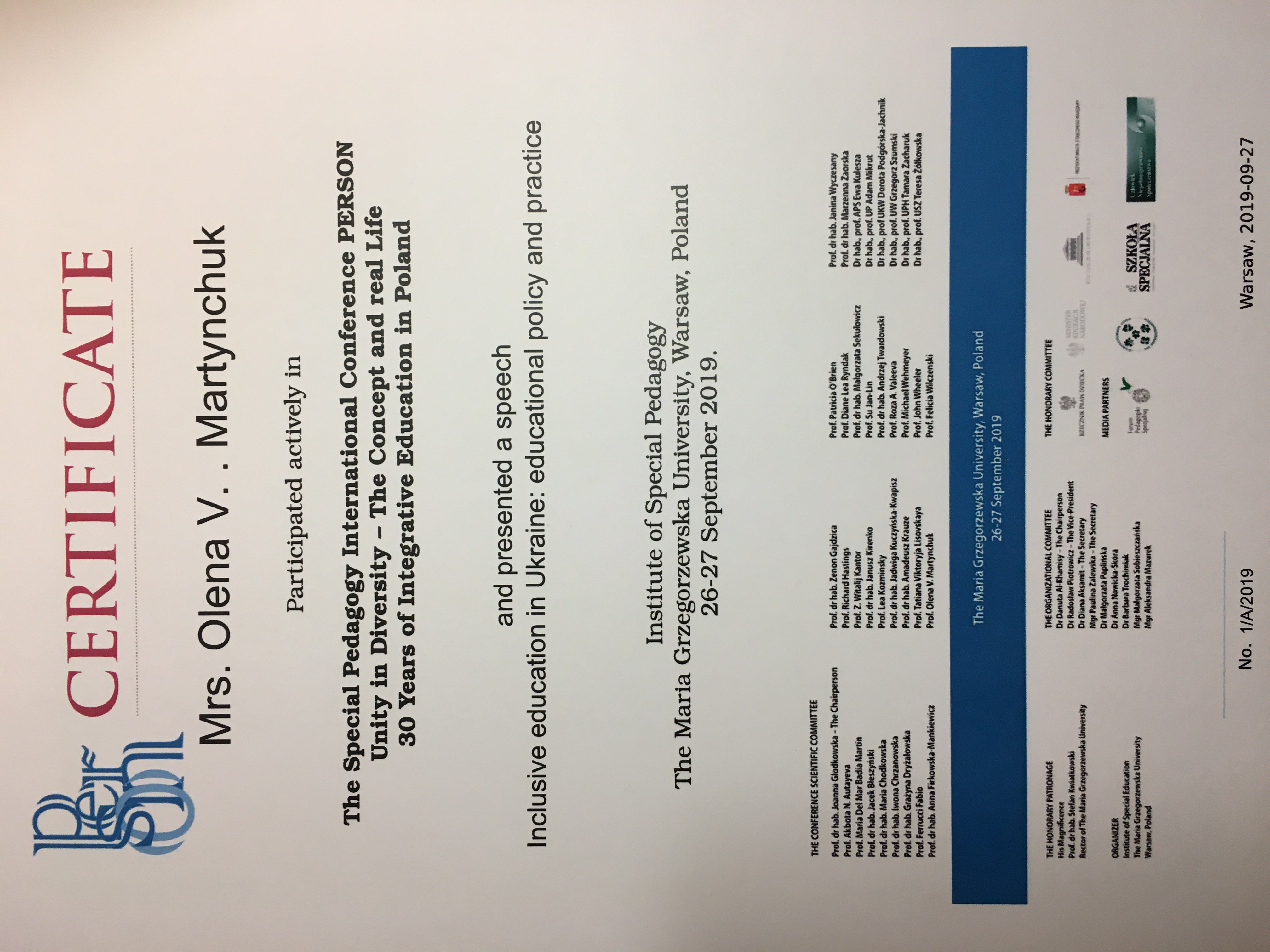 | 4791 | The Special Pedagogy International Conference PERSON Unity in Diversity - The Concept and real Life 30 Years of Integrative Education in PolandEducation | Inclusive education in Ukraine: educational policy and practice | Institute of Special Pedagogy The Maria Grzegorzewska University, Warsaw, Poland |