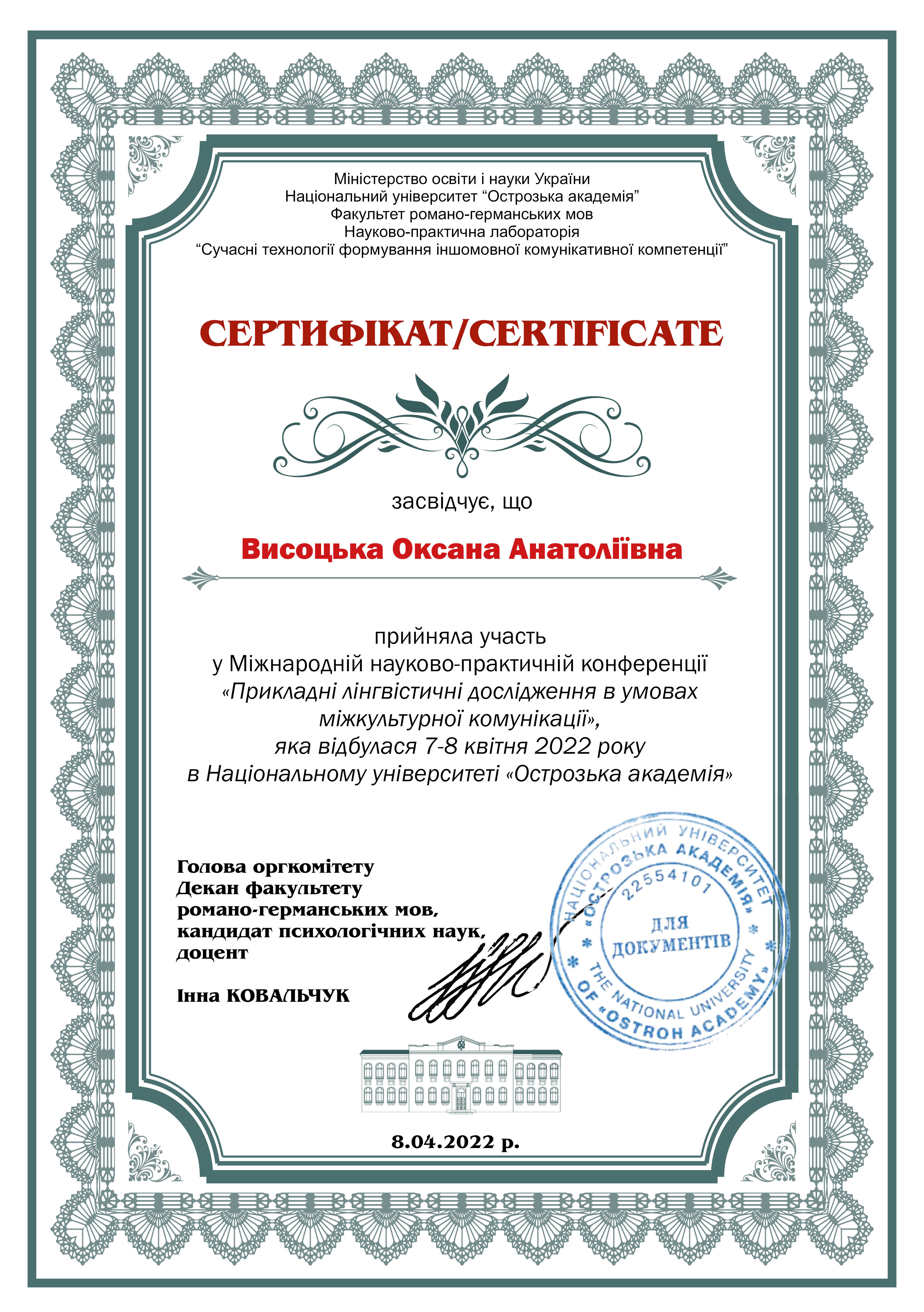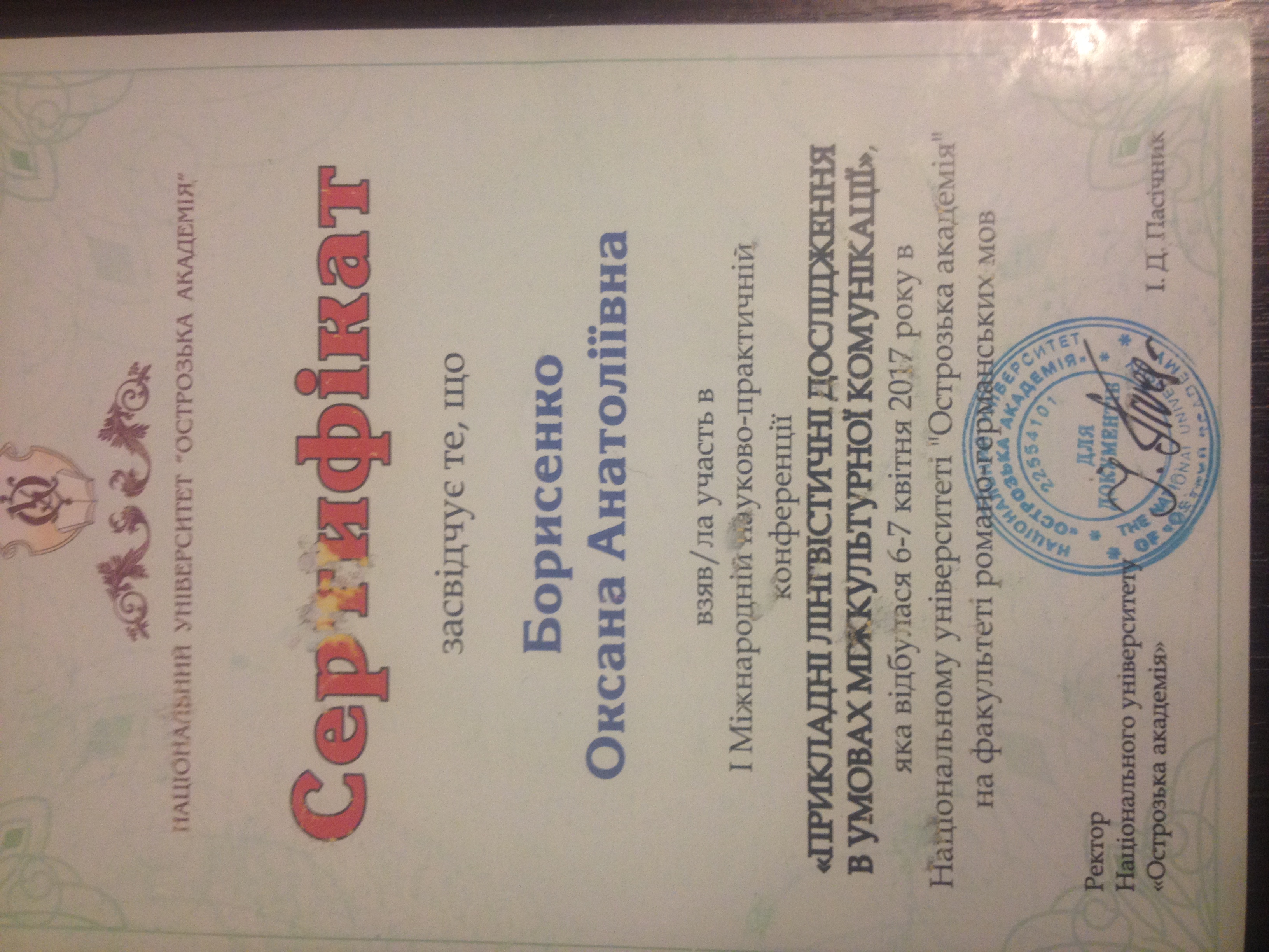 | 7589 | Прикладні лінгвістичні дослідження в умовах міжкультурної комунікації | Crosscultural Communication: Category of Gender in English and Ukrainian (співавтор — доц. С.С. Висоцька) | Національний університет Острозька Академія |