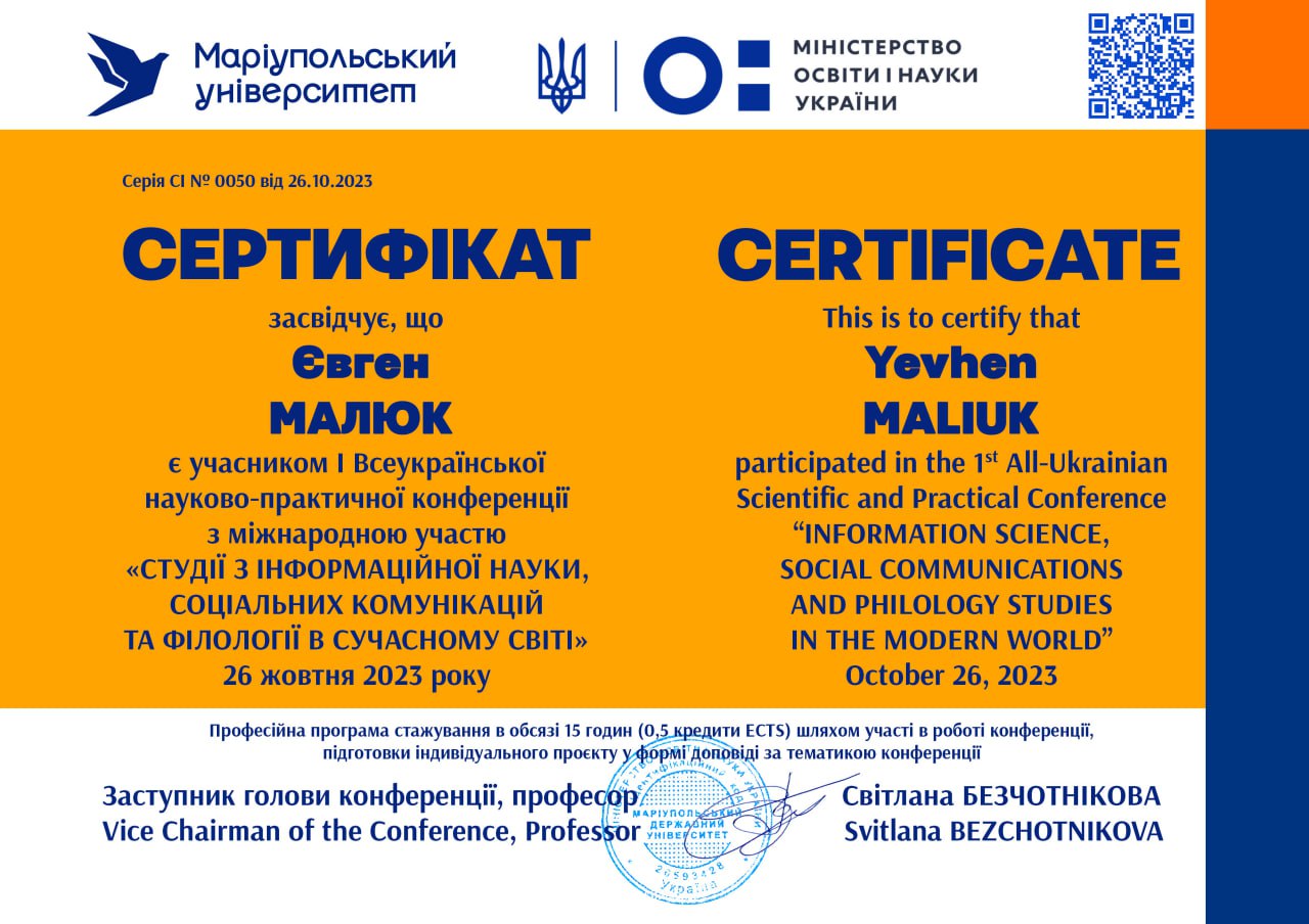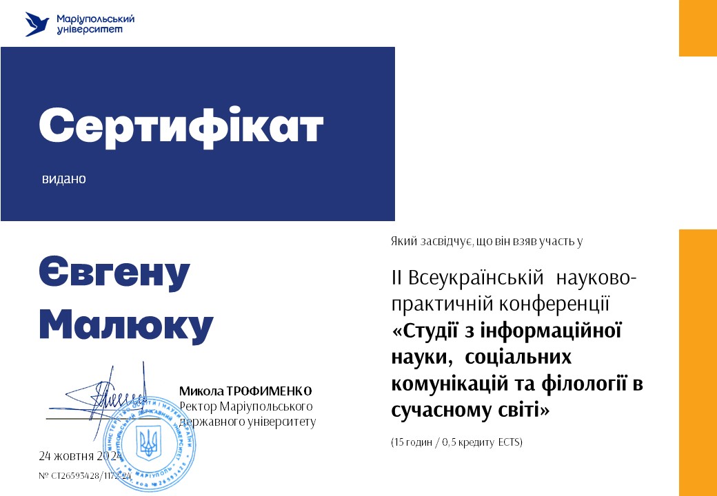| 724 | Факультет української філології, культури і мистецтва | Кафедра інформаційних комунікацій | 17.3 | 1 | 2025 | https://www.researchgate.net/profile/Yevhen-Maliuk |