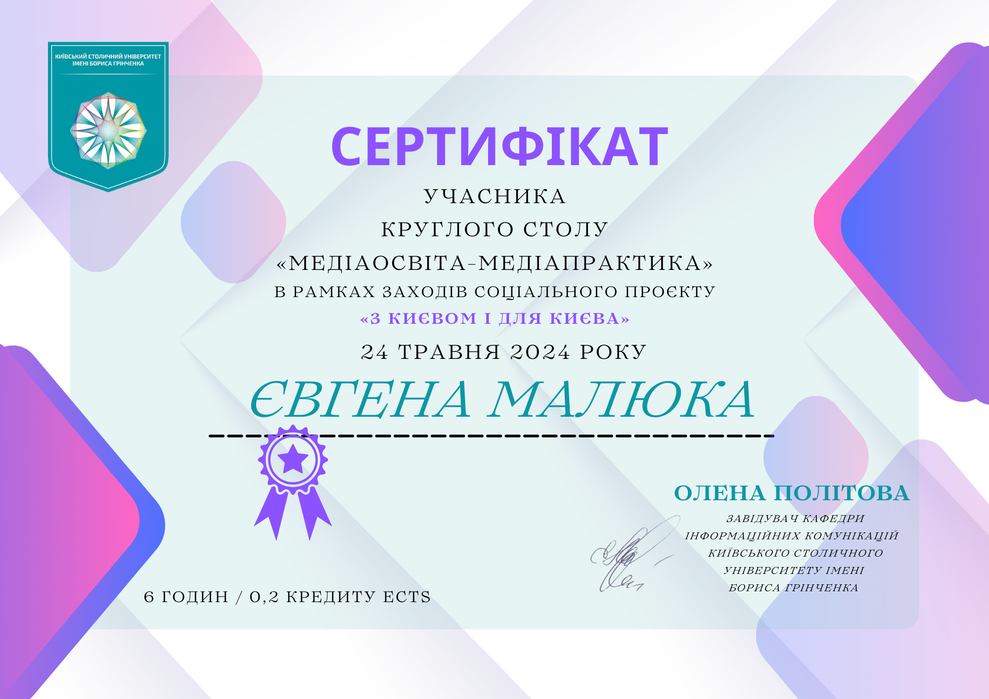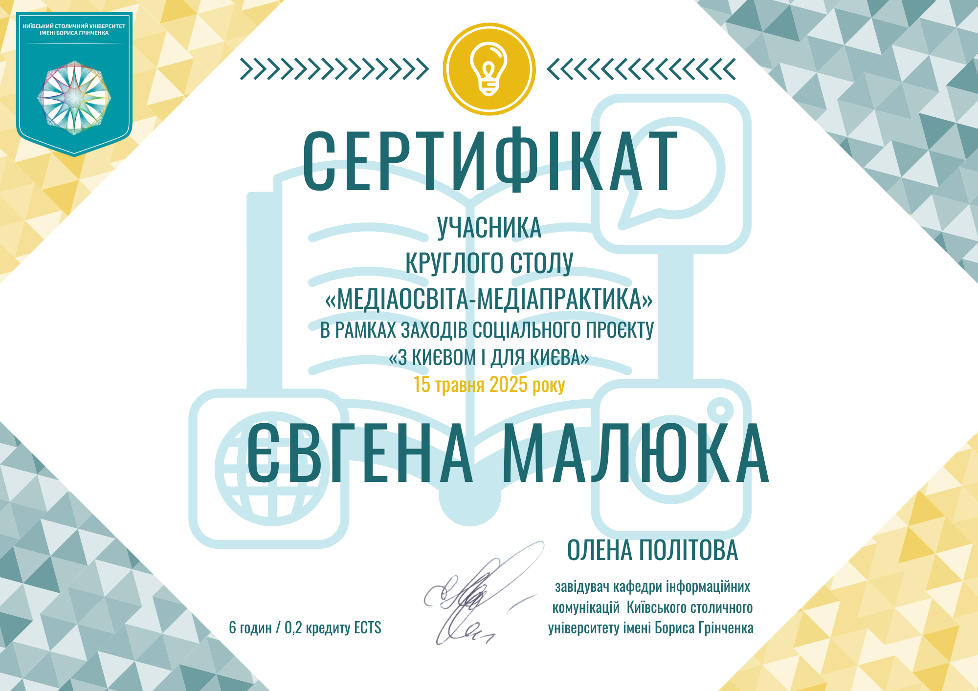| 11169 | Круглий стіл "Медіаосвіта-медіапрактика" в рамках заходів соціального проєкту "З Києвом - для Києва" | Розвиток фахових якостей майбутніх спеціалістів медіасфери: сучасні проблеми та шляхи їх вирішення | м. Київ, Київський столичний університет імені Бориса Грінченка |