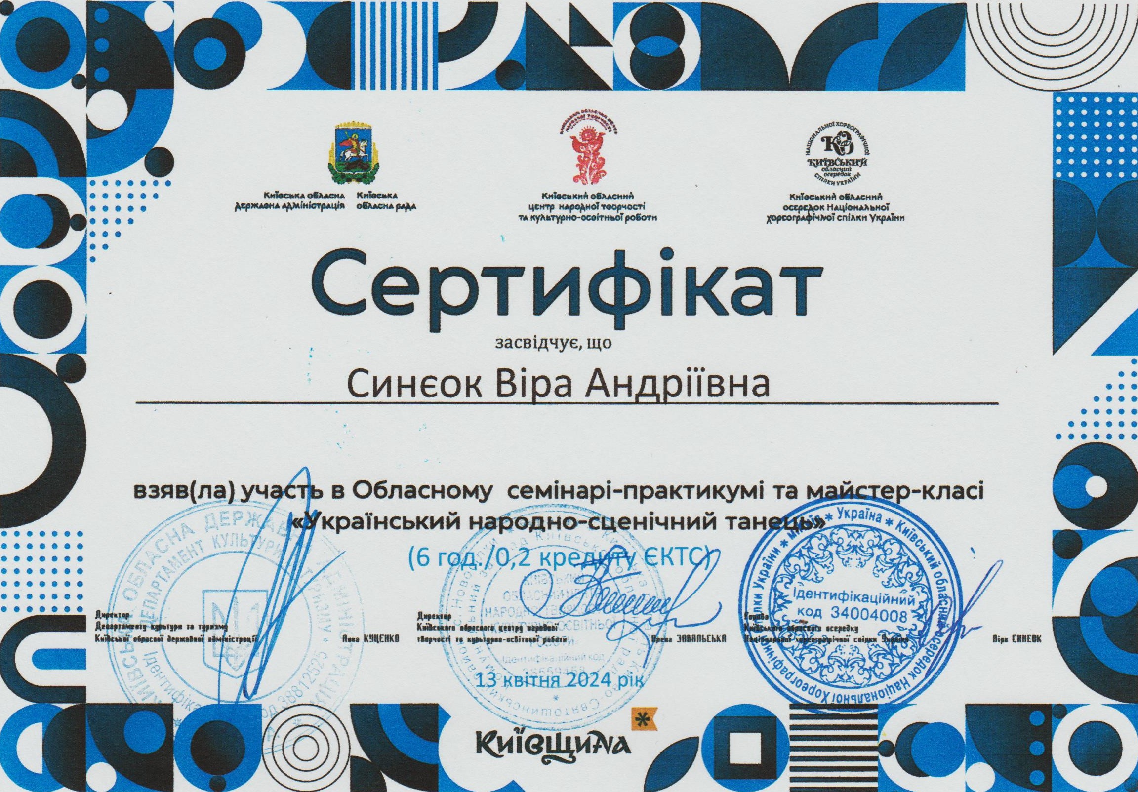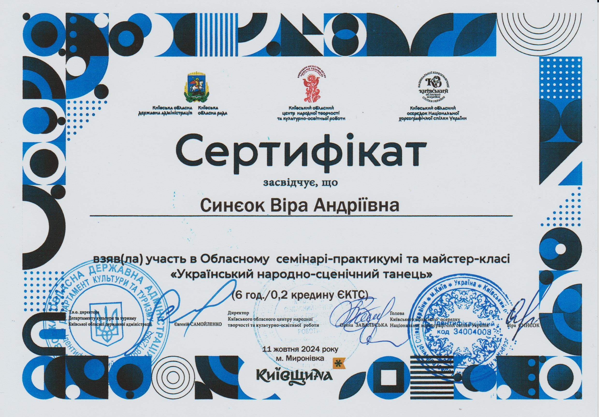 | 11054 | Обласний семінар-практикум та майстер-клас "Український народно-сценічний танець" | Система навчання та процес оволодіння мистецтвом українського народного танцю в дитячих аматорських хореографічних колективах Київської області | Васильків |