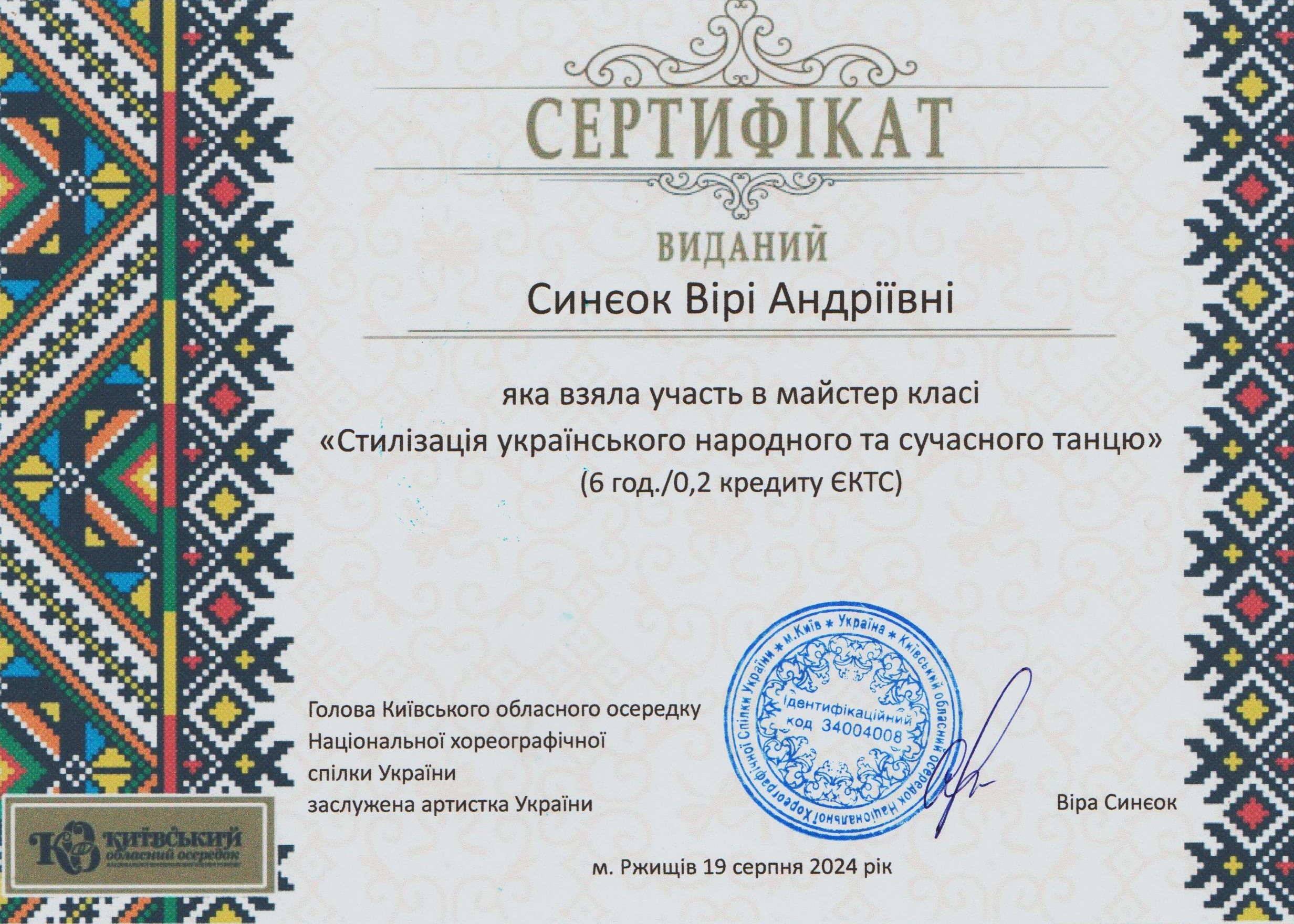 | 10642 | Майстер клас "Стилізація сучасного та народно-сценічного танцю" | Стилізація сучасного та народно-сценічного танцю | Ржищів |