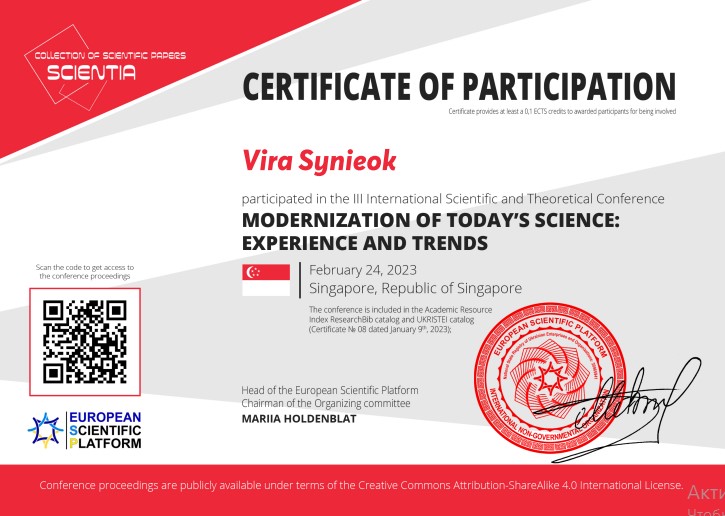 | 8886 | ІІІ Міжнародна науково-теоретична конференція «Modernization of today’s science experience and trends» | Засади національно-патріотичного виховання здобувачів хореографічної освіти | Сінгапур |
