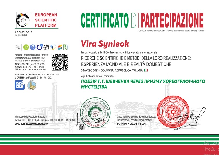 | 8904 | ІІІ Міжнародна науково-практична конференція «Ricerche scientifiche e metodi della loro realizzazione: esperenza mondiale e realta domestiche» | Поезія Т. Г. Шевченка через призму хореографічного мистецтва | Болонья |