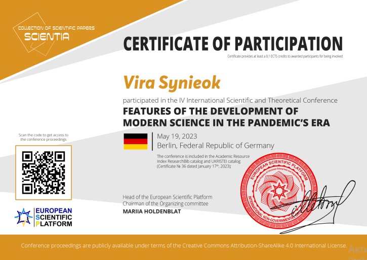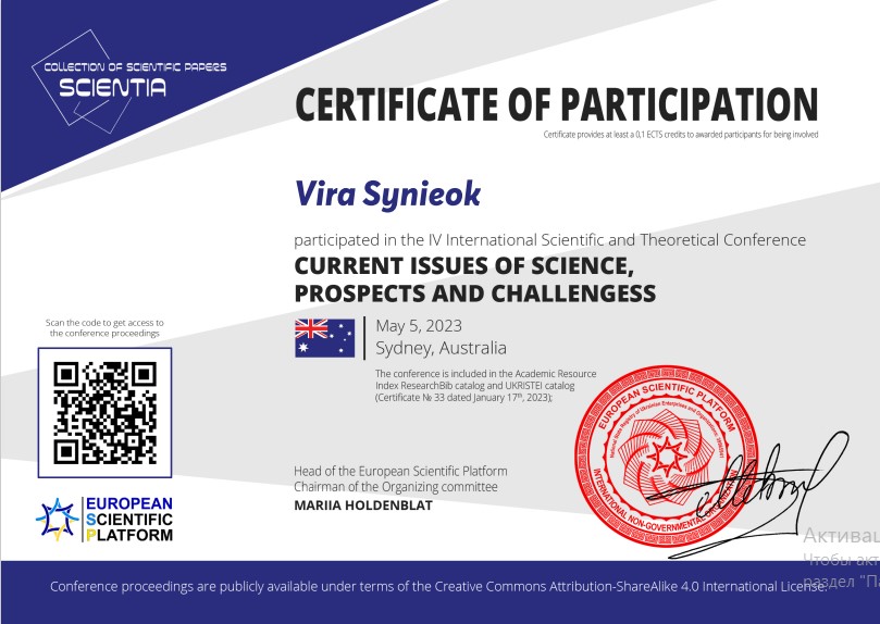 | 9143 | ІV Міжнародна науково-теоретична конференція «Current issues of science, prospects and challenges» | Український народний танець в закладах вищої освіти | Сідней |