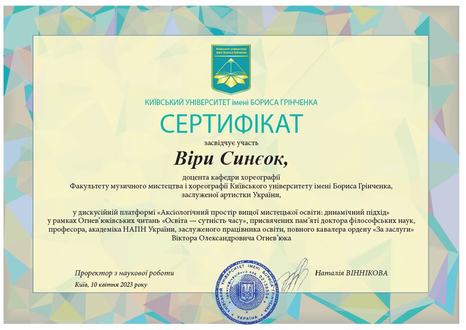 | 652 | Факультет музичного мистецтва і хореографії | Кафедра хореографії | 2 | 1 | 2025 | https://www.researchgate.net/profile/Vira-Synieok |