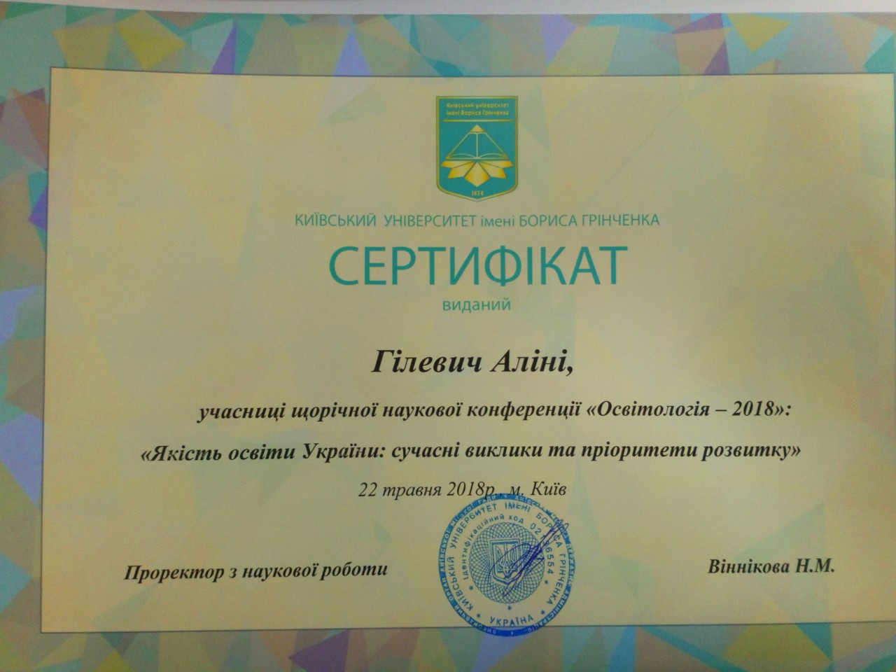 | ID | Назва | Тема доповіді | Місце проведення | Документ, що засвідчує | Дата проведення |