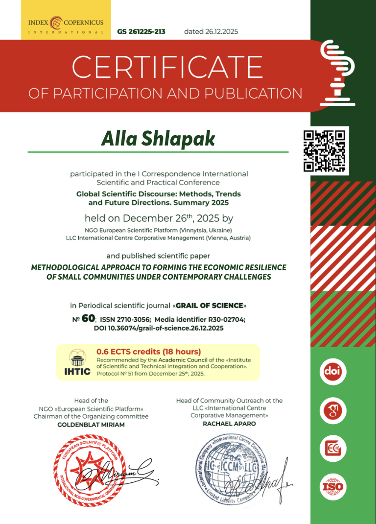 12957 Global Scientific Discourse: Methods, Trends and Future Directions. Summary 2025 Methodological approach to forming the economic resilience of small communities under contemporary challenges NGO European Scientific Platform (Vinnytsia, Ukraine) LLC International Centre Corporative Management (Vienna, Austria) document
