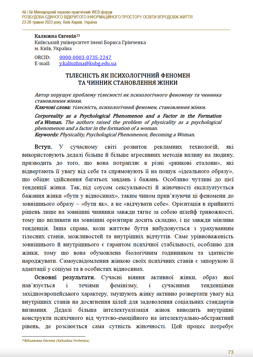 | 10067 | Розбудова єдиного відкритого інформаційного простору освіти впродовж життя (Forum-SOIS, 2023) | Тілесність як психологічний феномен та чинник становлення жінки | Київ |