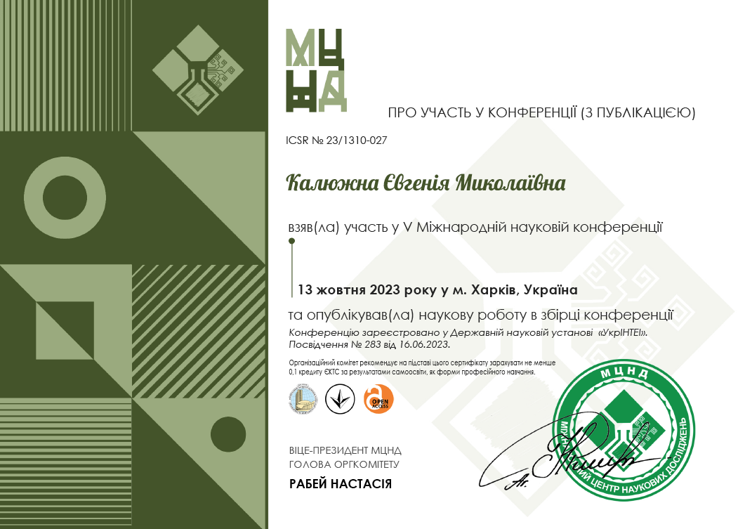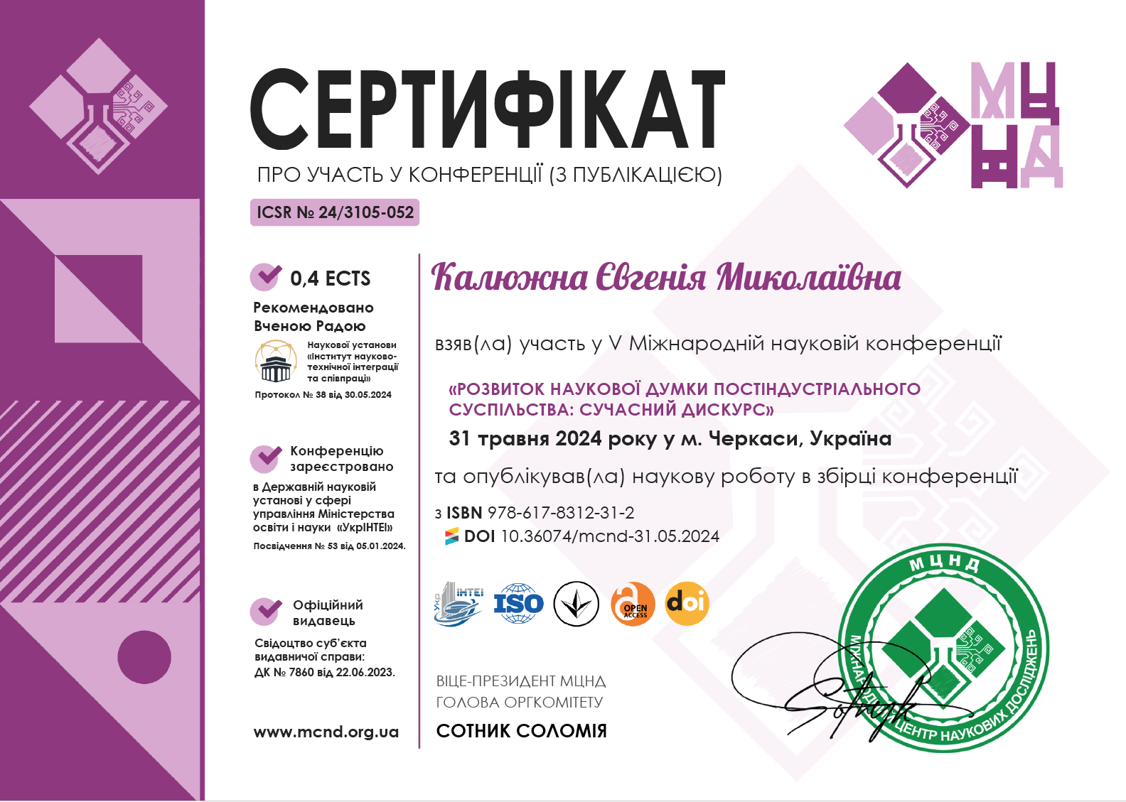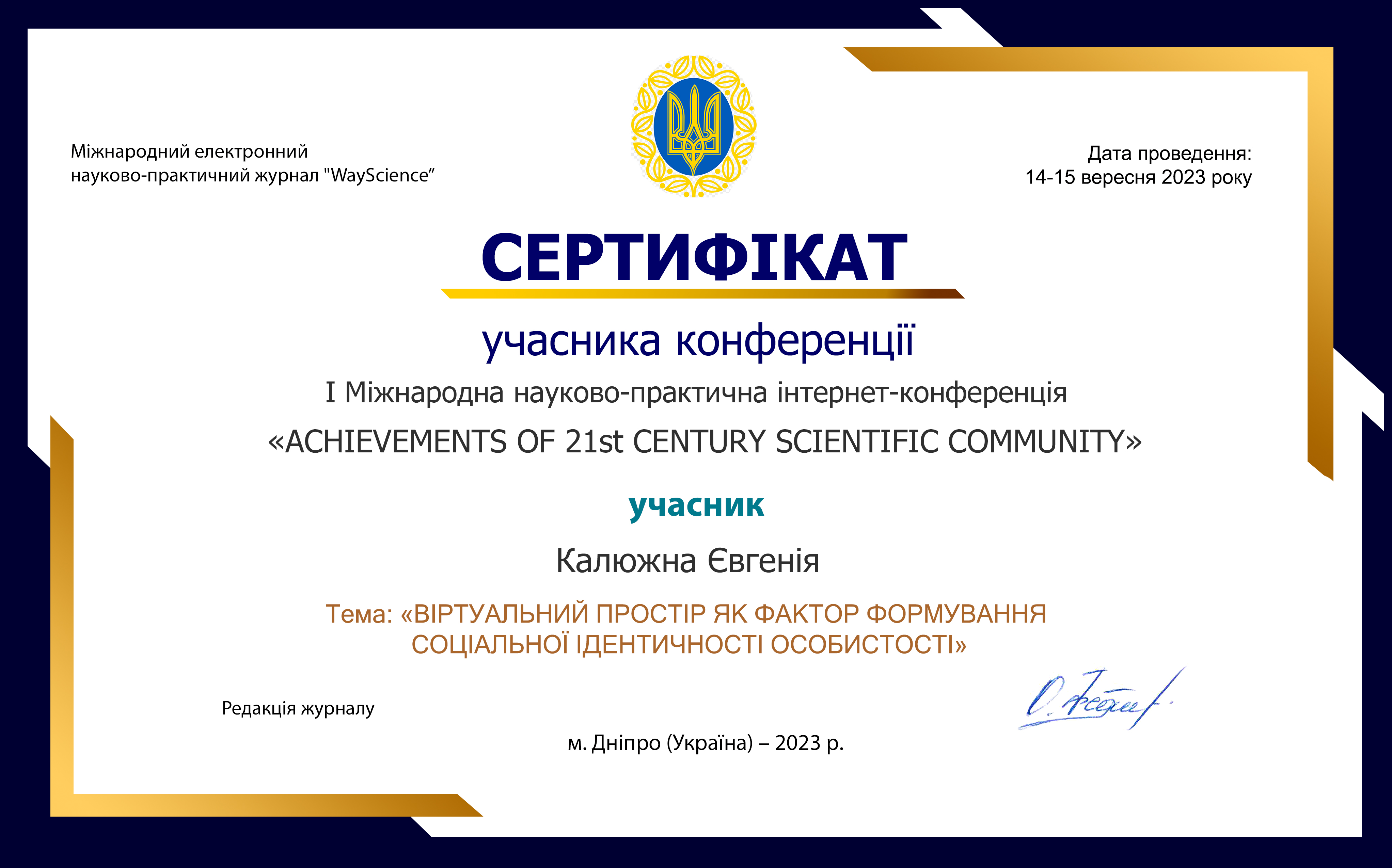 | 10068 | Achievements of 21st Century Scientific Community | Віртуальний простір як фактор формування соціальної ідентичності особистості | Дніпро |