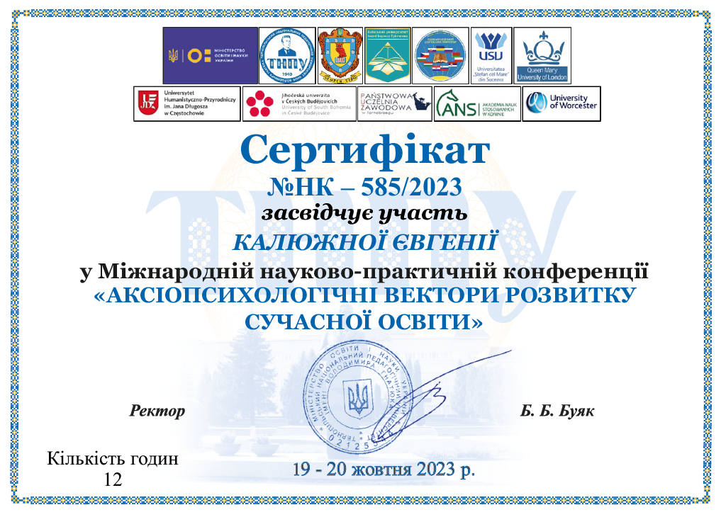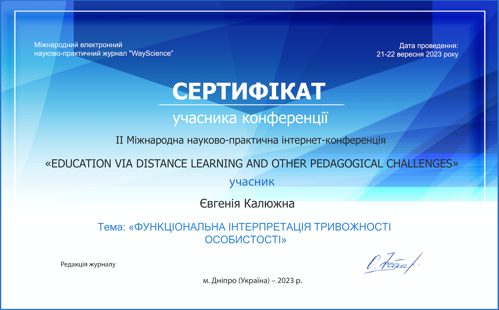 | 10069 | Education via Distance Learning and other Pedagogical Challenges | Функціональна інтерпретація тривожності особистос | Дніпро |