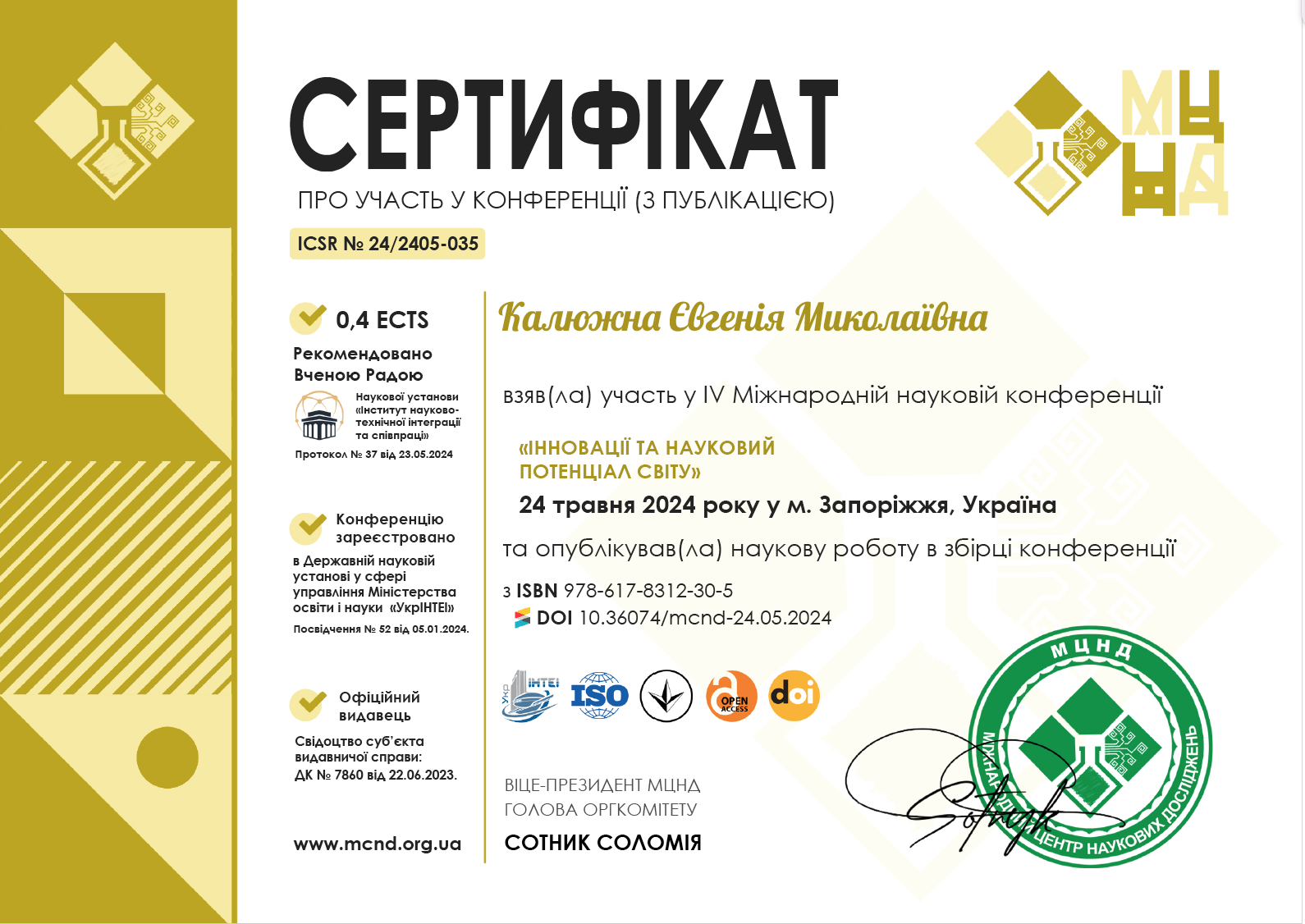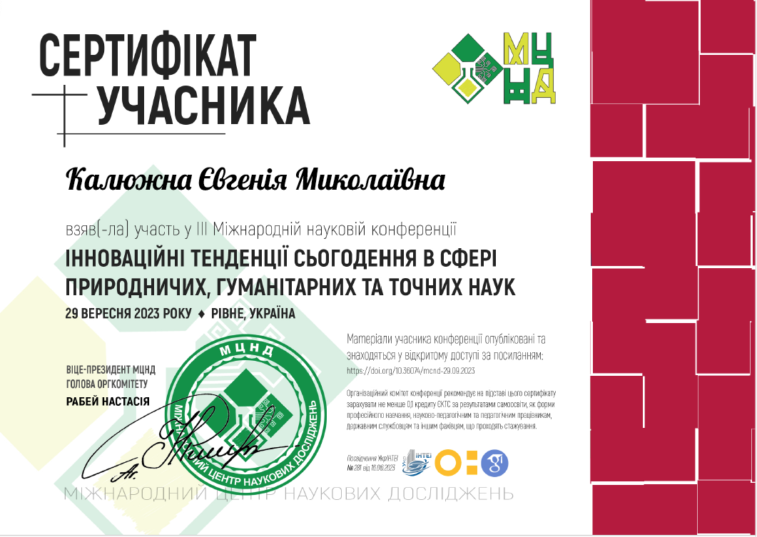 | 10073 | Інноваційні тенденції сьогодення в сфері природничих, гуманітарних та точних наук | Functional conceptualization of personality anxiety | Рівне |