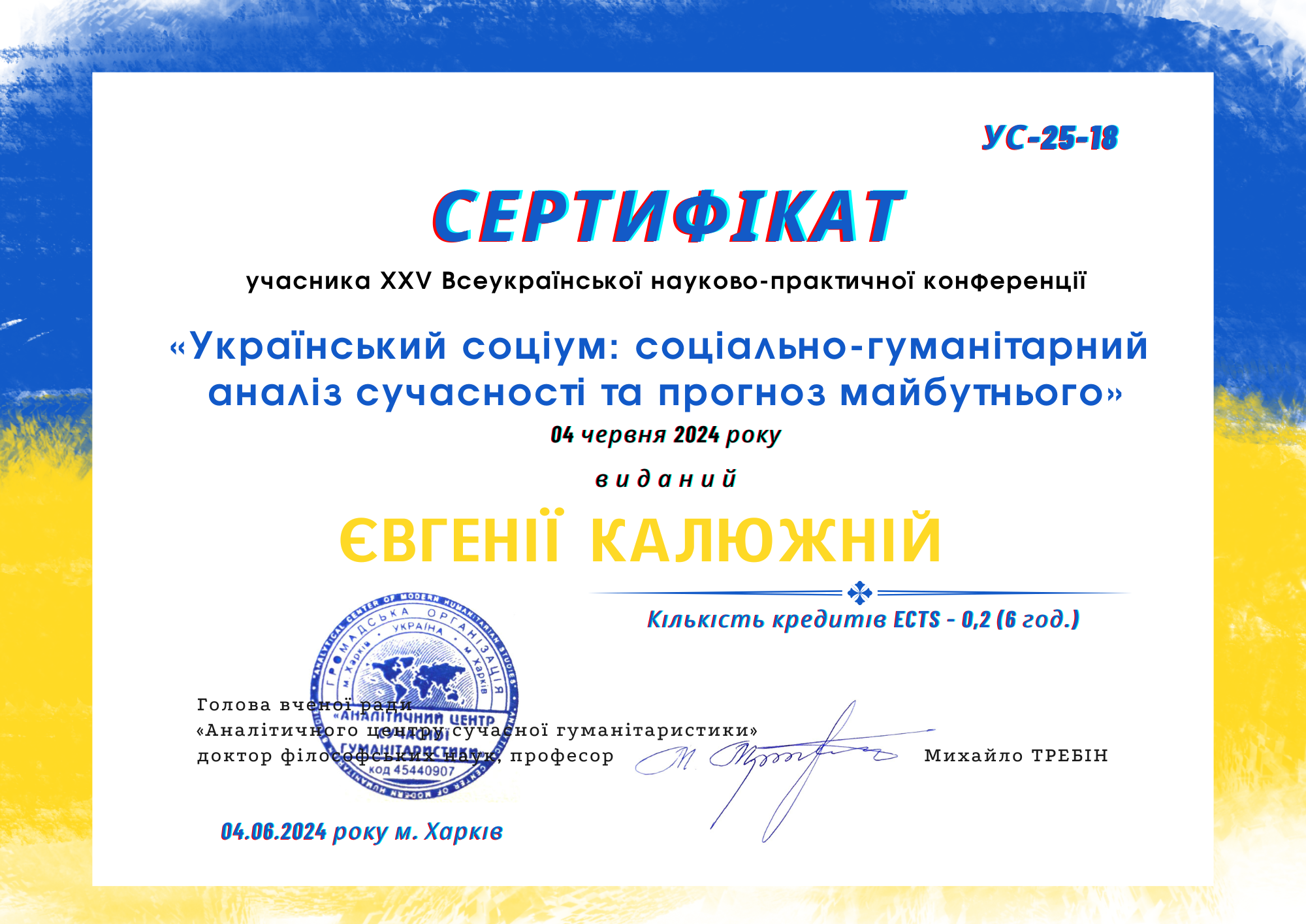 | 887 | Факультет психології, соціальної роботи та спеціальної освіти | Кафедра практичної психології | 3.2 | 1 | 2023 | https://www.researchgate.net/profile/Yevheniia-Kaliuzhna/research |