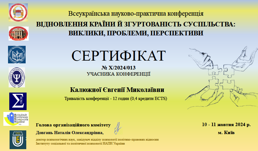 | 11657 | Відновлення країни й згуртованість суспільства: виклики, проблеми, перспективи | Інструменти і методи психологічної підтримки в реаліях війни | Київ |