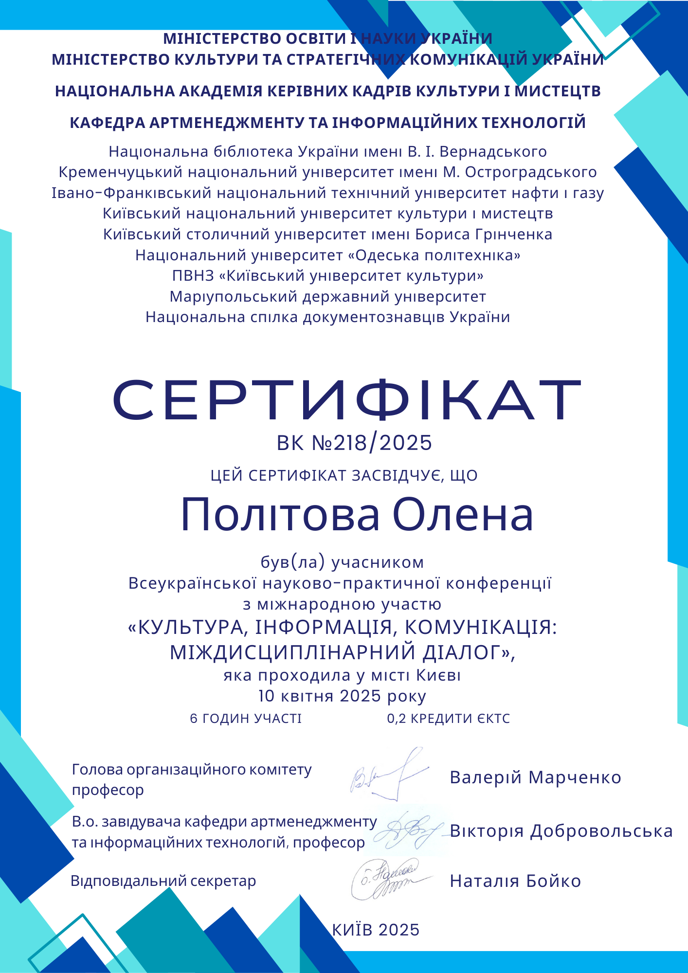 | 873 | Факультет української філології, культури і мистецтва | Кафедра інформаційних комунікацій | 15.4 | 2 | 2025 | https://www.researchgate.net/profile/Olena-Politova |