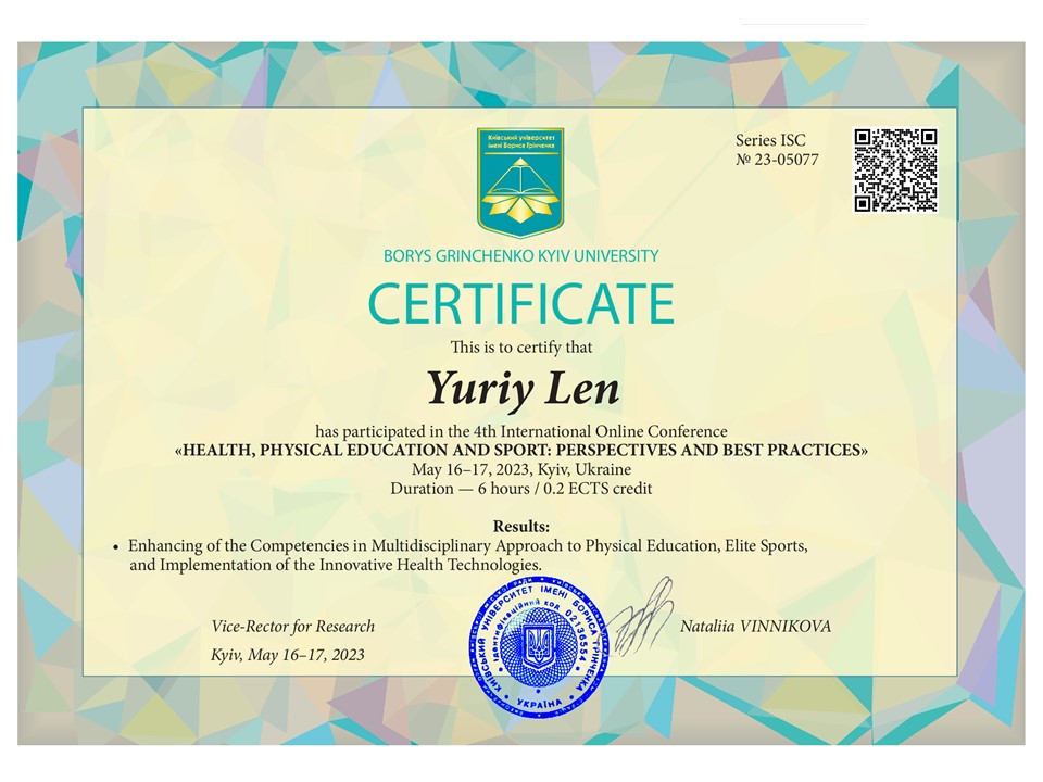 | 855 | Факультет здоров'я, фізичного виховання і спорту | Кафедра спорту та фітнесу | 0 | 0 | 2024 | https://www.researchgate.net/profile/Yurii-Len |