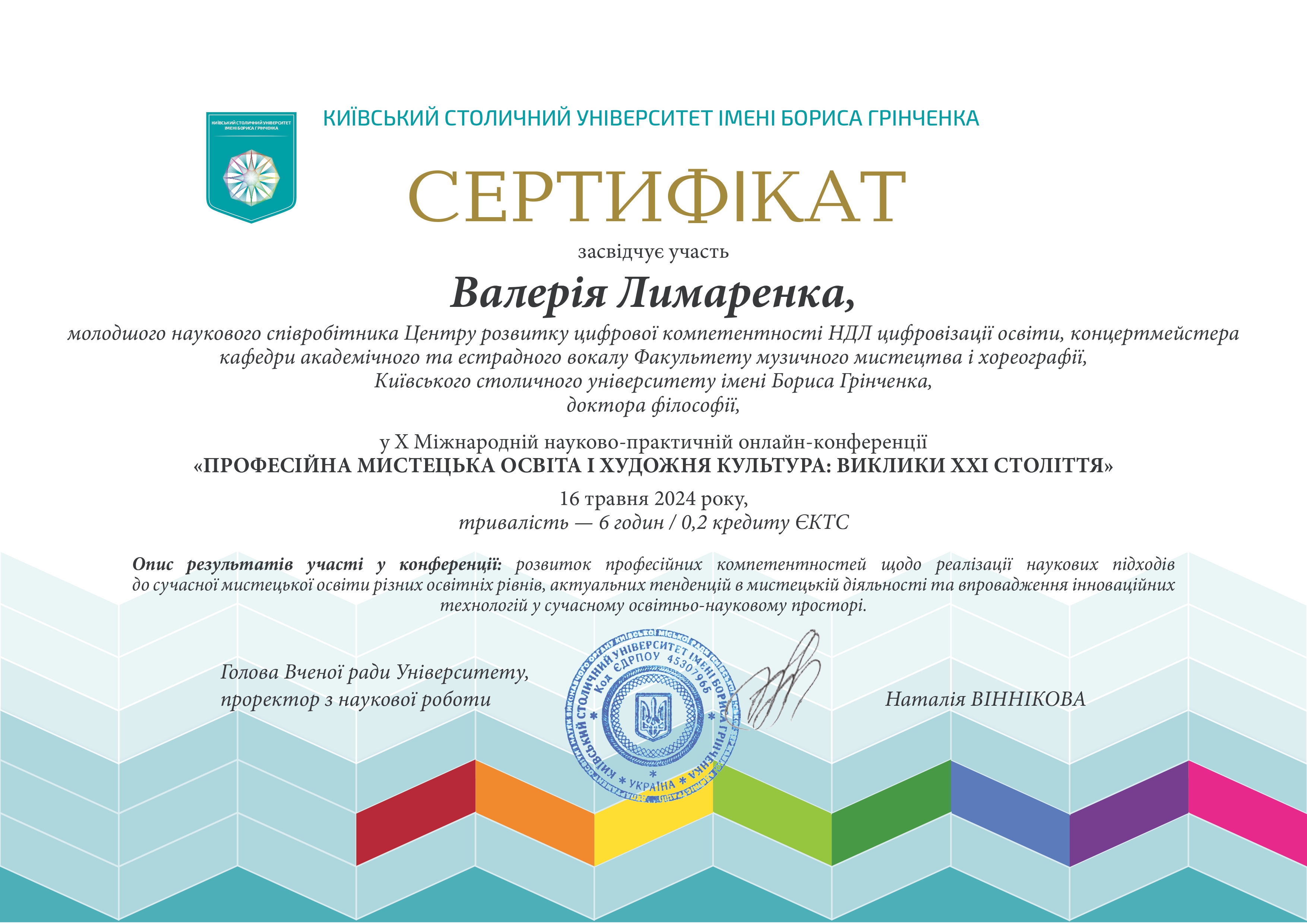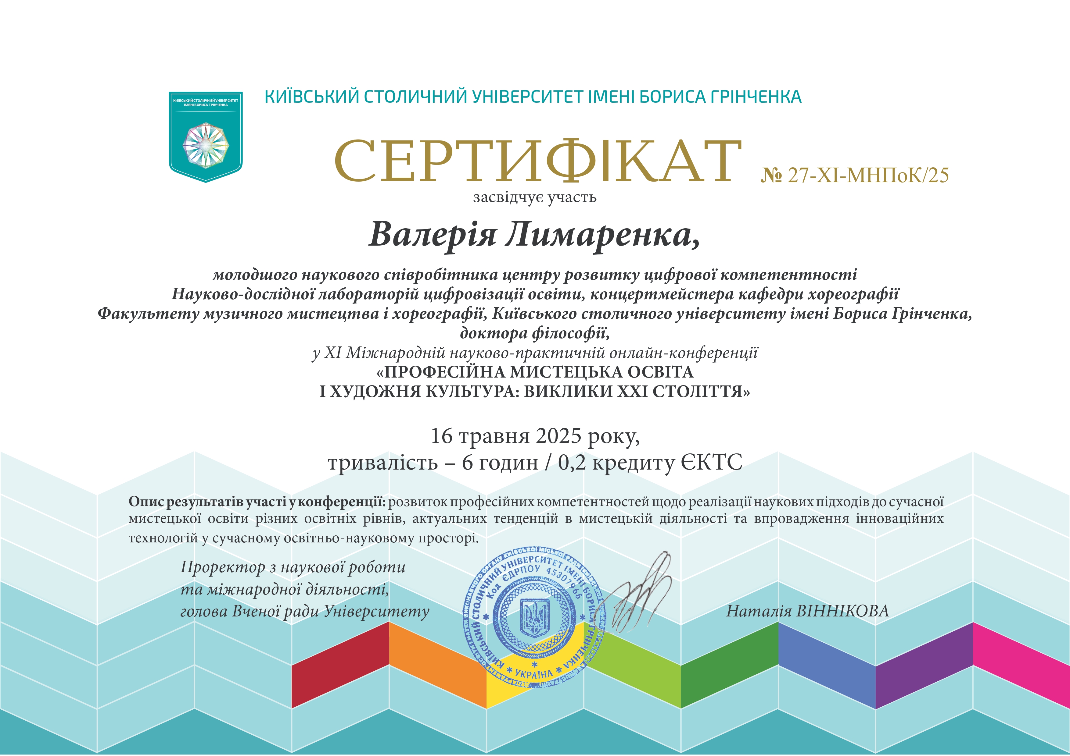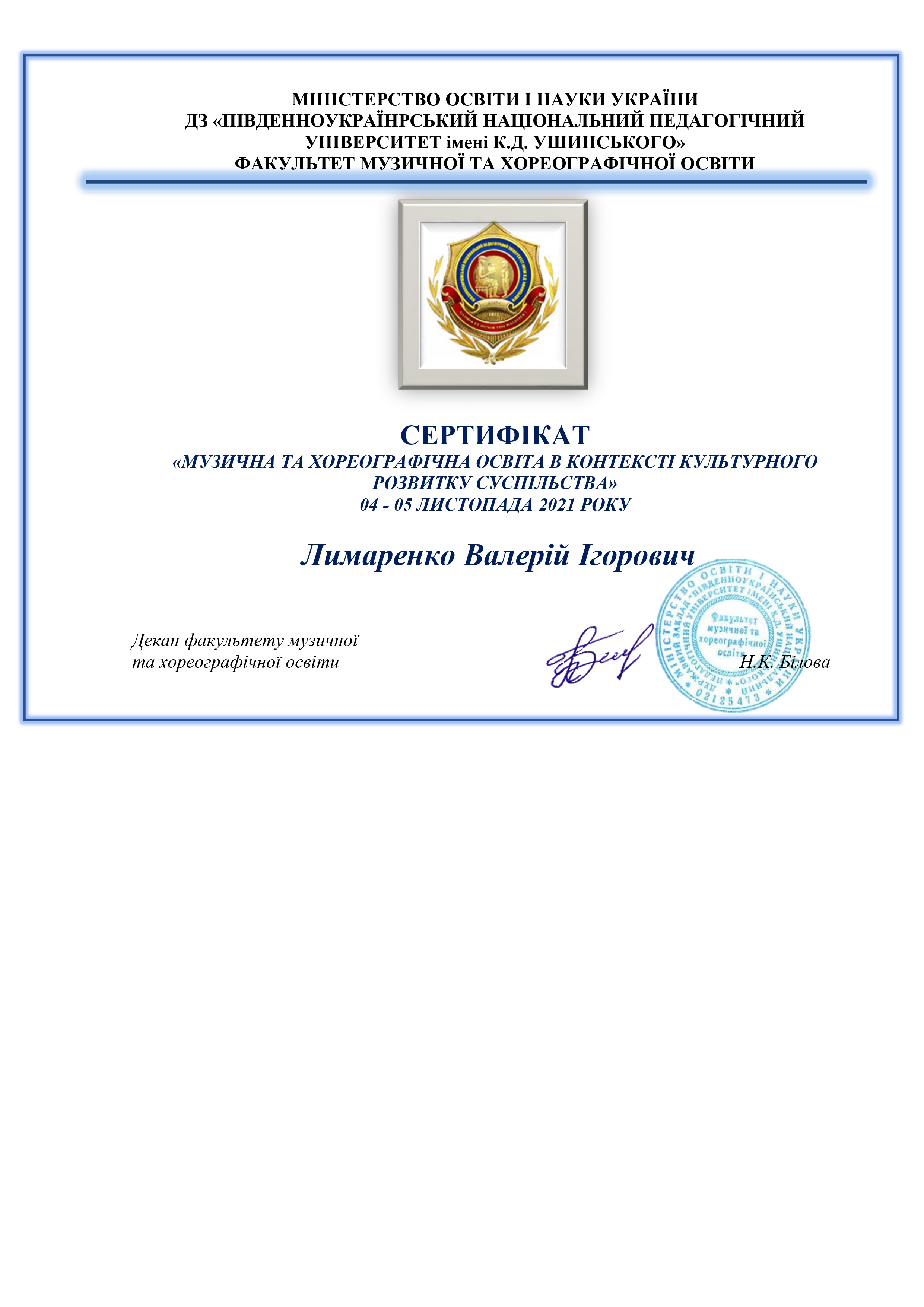 | 877 | Факультет музичного мистецтва і хореографії | Кафедра музикознавства та музичної освіти | 1.7 | 1 | 2025 | https://www.researchgate.net/profile/Valerii-Lymarenko |