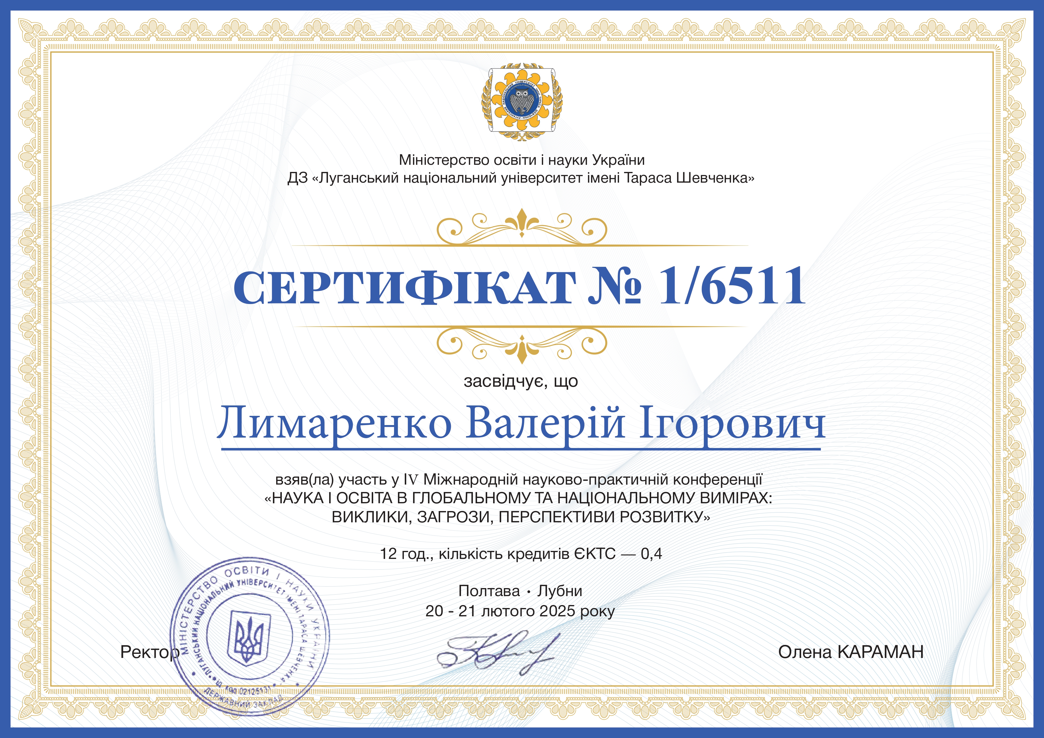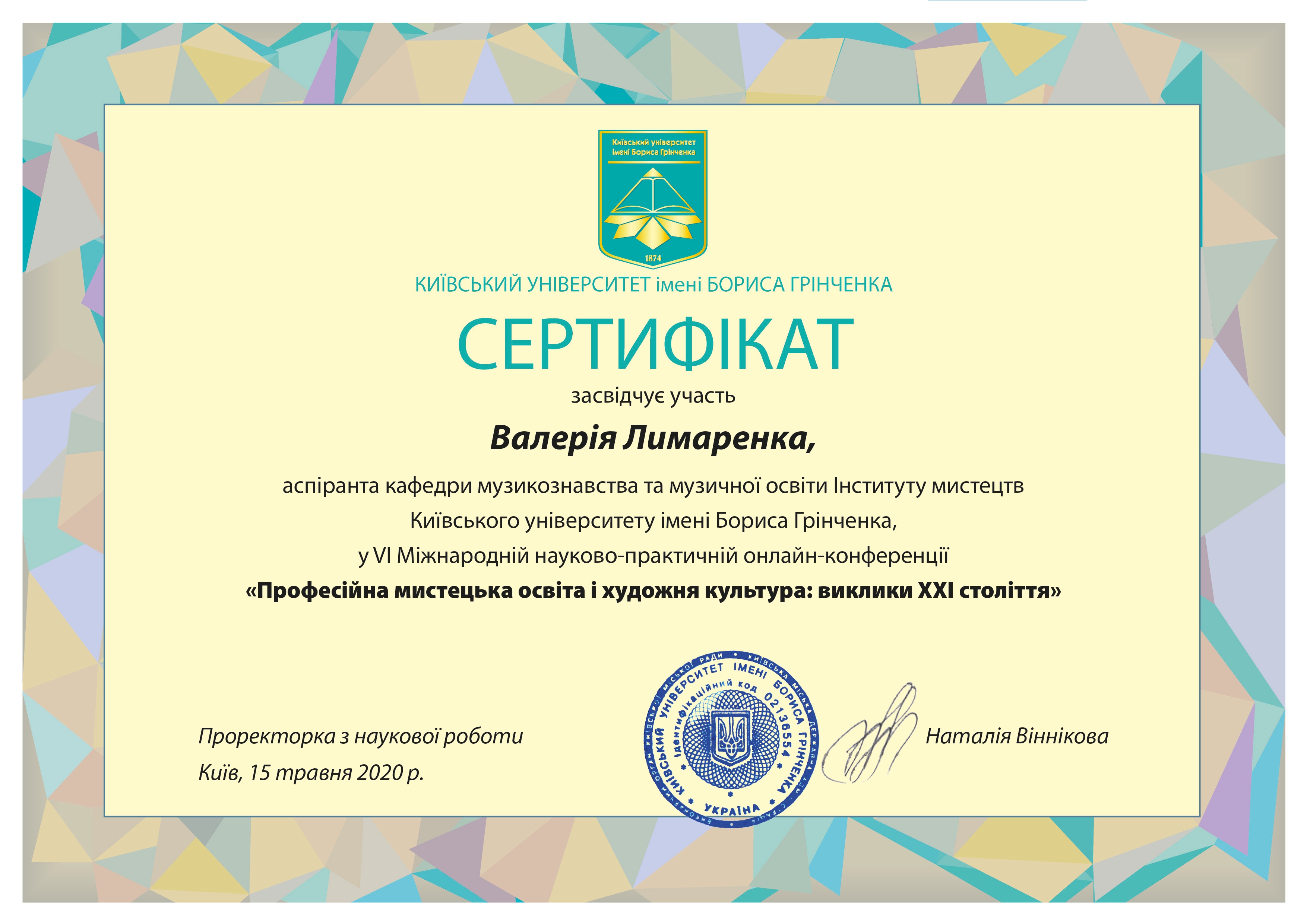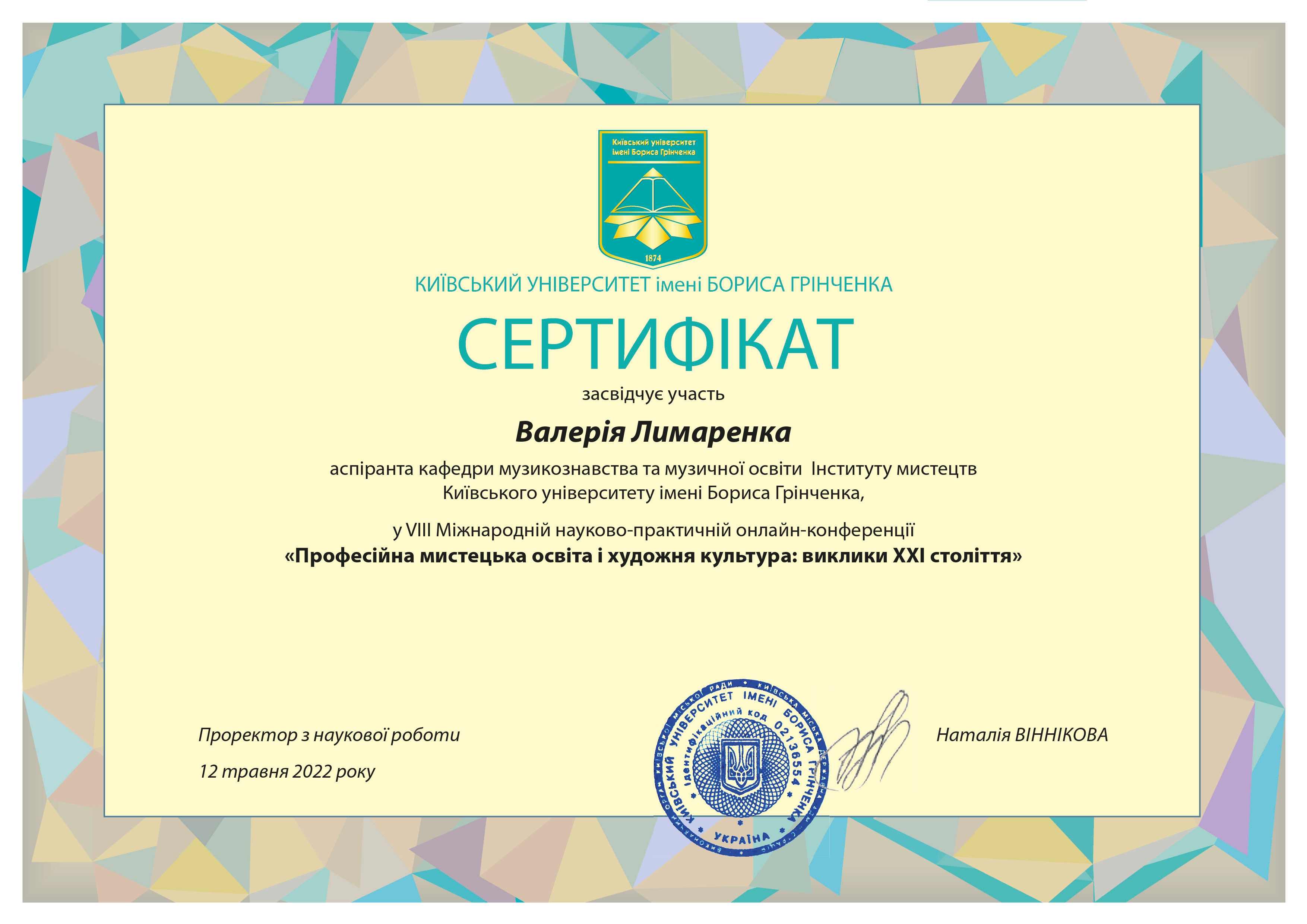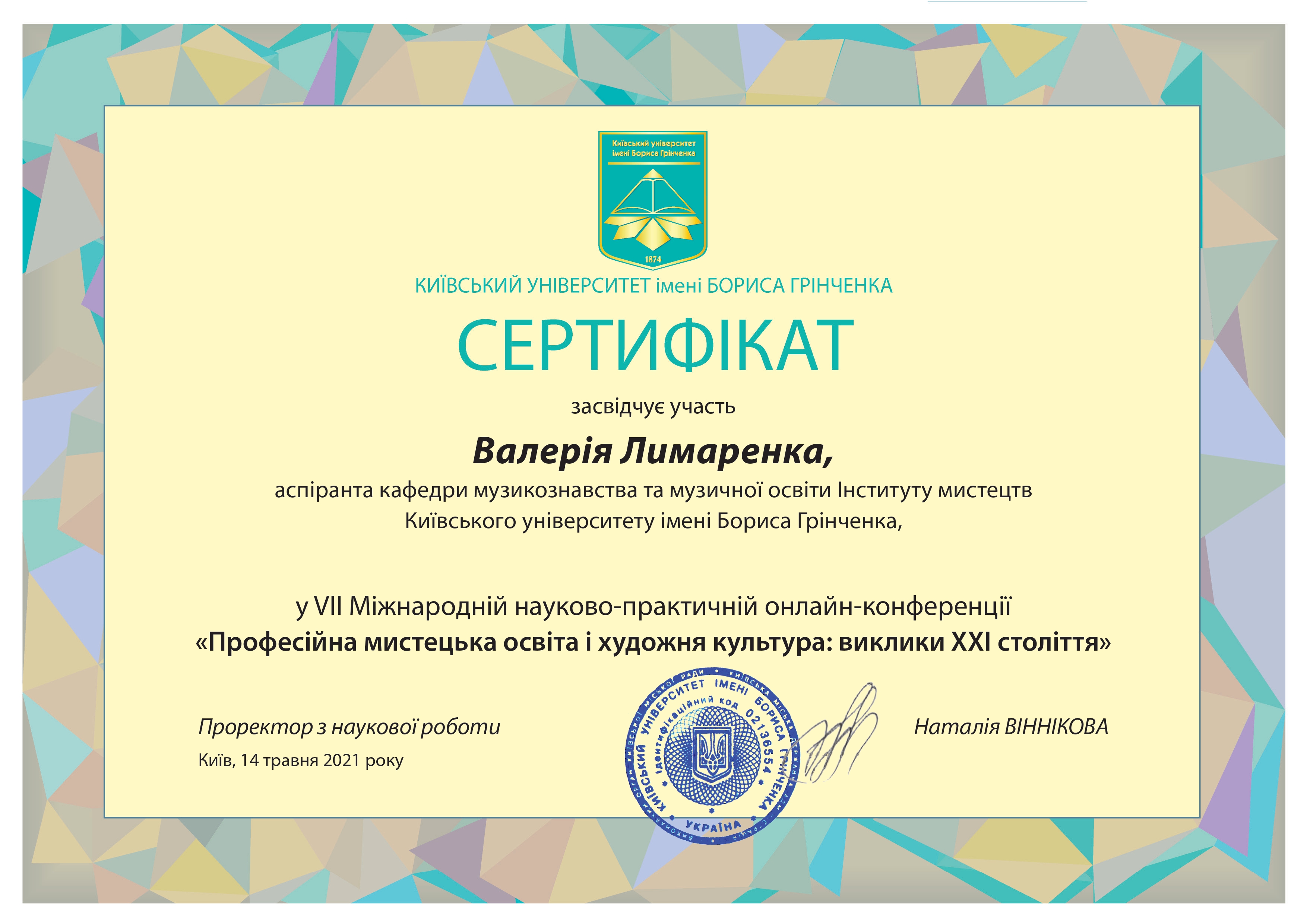 | 877 | Факультет музичного мистецтва і хореографії | Кафедра музикознавства та музичної освіти | 1.7 | 1 | 2025 | https://www.researchgate.net/profile/Valerii-Lymarenko |