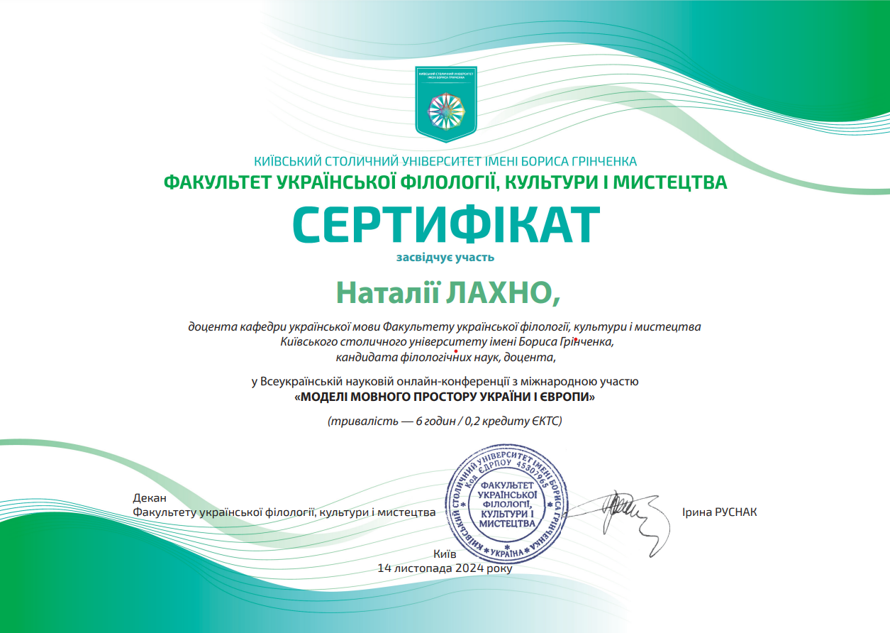 | 520 | Факультет української філології, культури і мистецтва | Кафедра української мови | 27.1 | 1 | 2025 | https://www.researchgate.net/profile/Natalia_Lakhno |