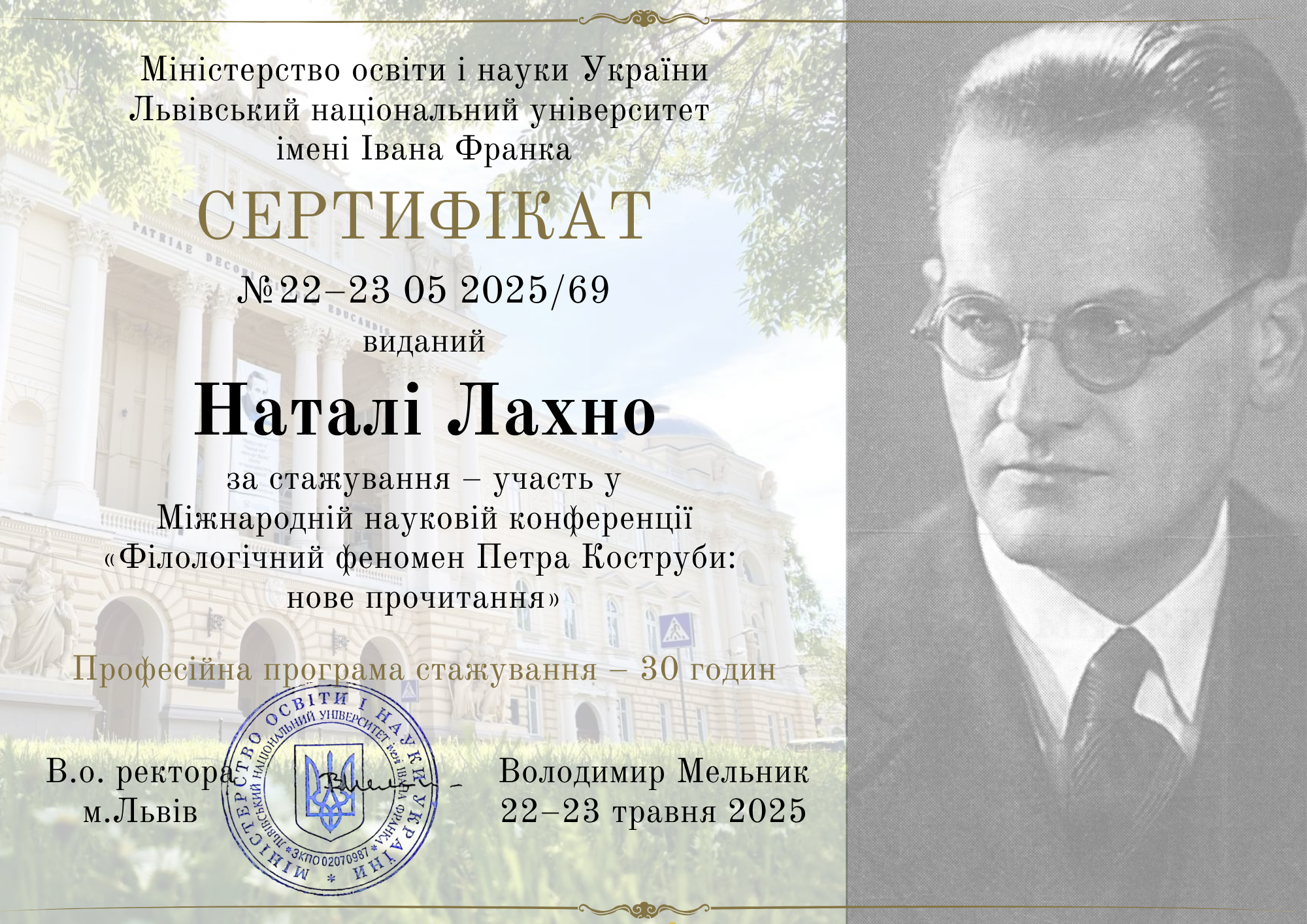| 12113 | Міжнародна наукова конференція «Філологічний феномен Петра Коструби: нове прочитання» | Дериваційна характеристика ергонімікону міста Києва | м. Львів, Україна |