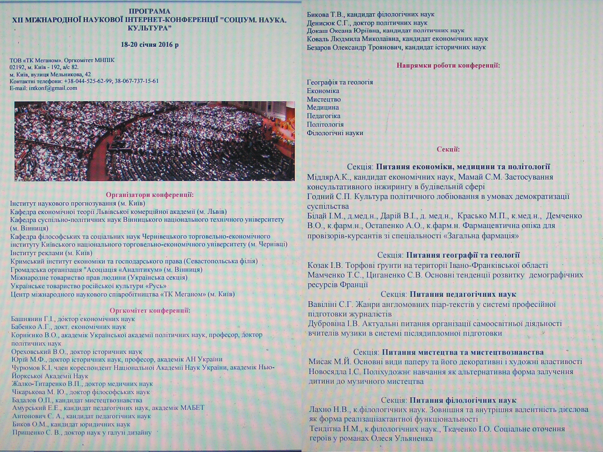 | 11840 | The 7th International scientific and practical conference “Sociological and psychological models of youth communication” | Символіка фітонімів дитячого ергонімікону міста Києва. | Копенгаген |