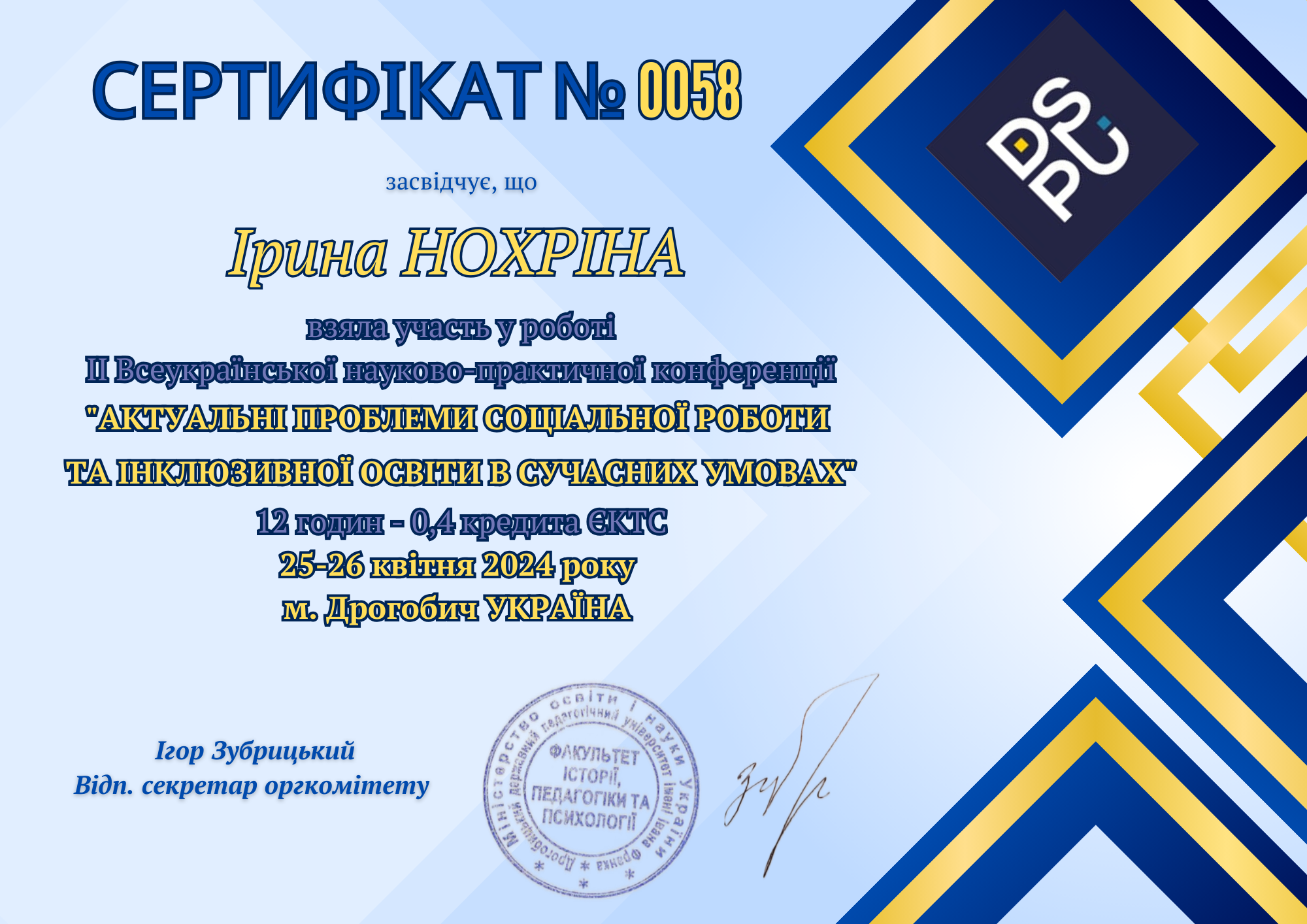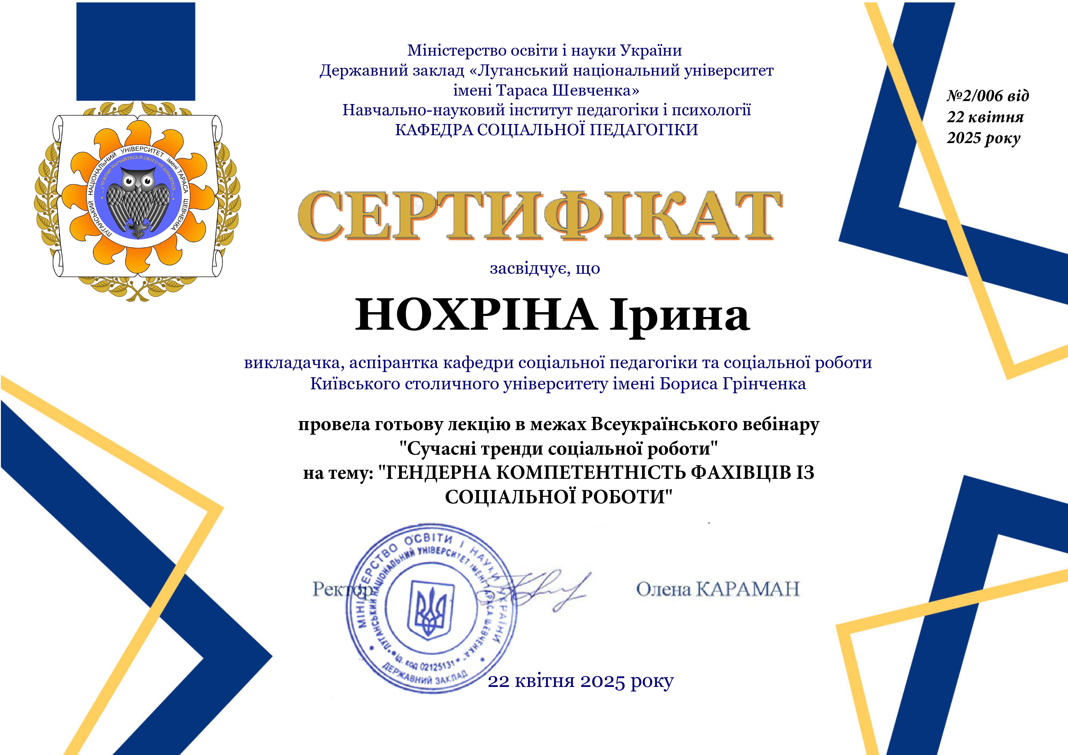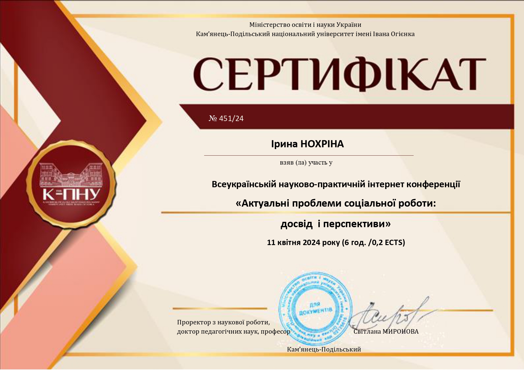 | 1160 | Факультет психології, соціальної роботи та спеціальної освіти | Кафедра соціальної педагогіки та соціальної роботи | 3.1 | 2 | 2024 | https://www.researchgate.net/profile/Iryna-Nokhrina/stats |