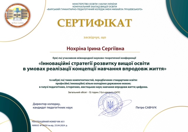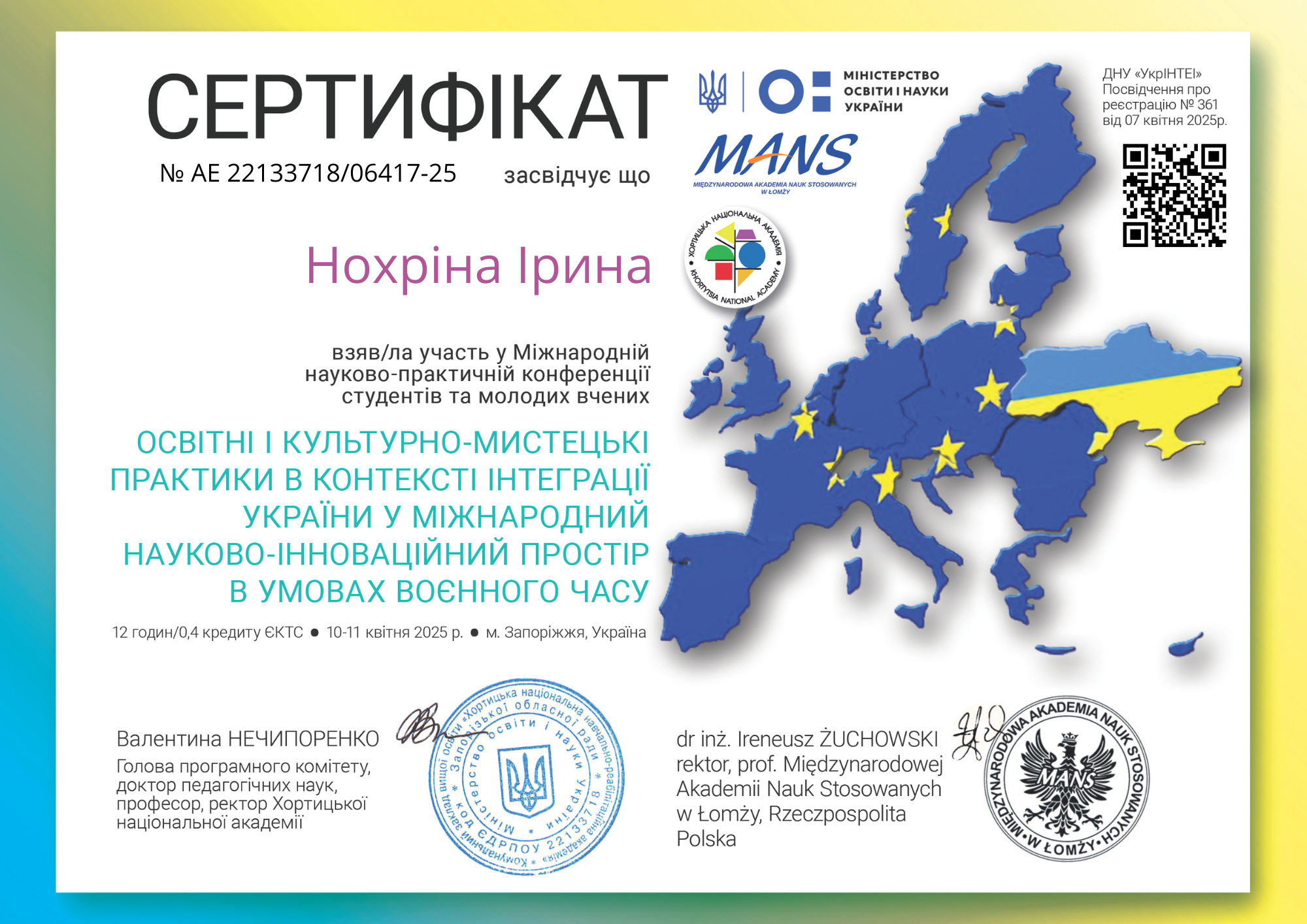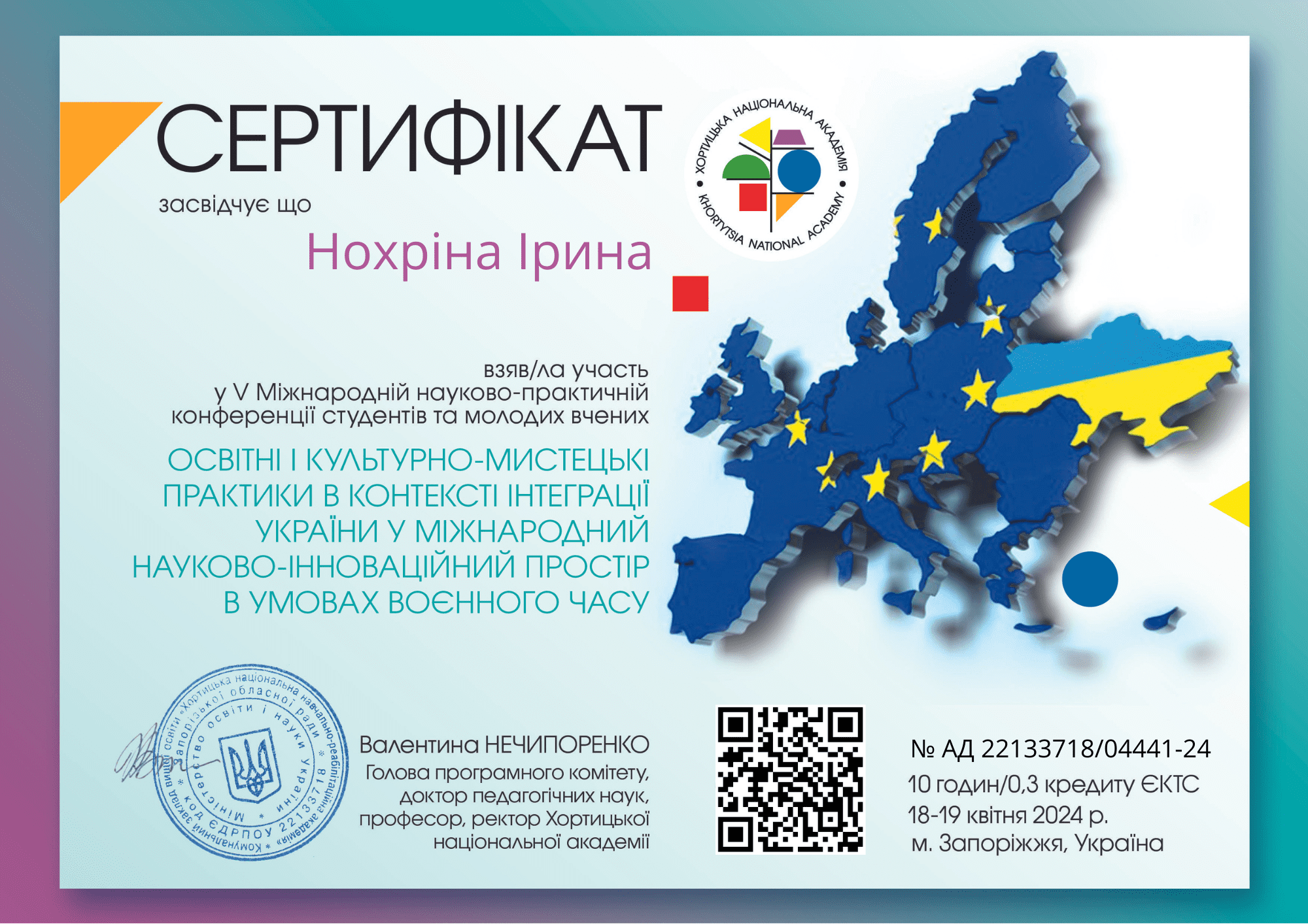 | 12017 | VI Міжнародна науково-практична конференція студентів та молодих учених «Освітні і культурно-мистецькі практики в контексті інтеграції України у міжнародний науково-інноваційний простір в умовах воєнного часу» | Соціально-психологічні детермінанти рівня домагань студентів в умовах воєнного стану | Запоріжжя |