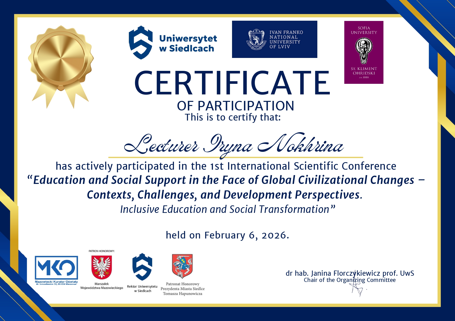 | 972 | Факультет психології, соціальної роботи та спеціальної освіти | Кафедра соціальної педагогіки та соціальної роботи | 23.3 | 2 | 2025 | https://www.researchgate.net/profile/Iryna-Nokhrina |