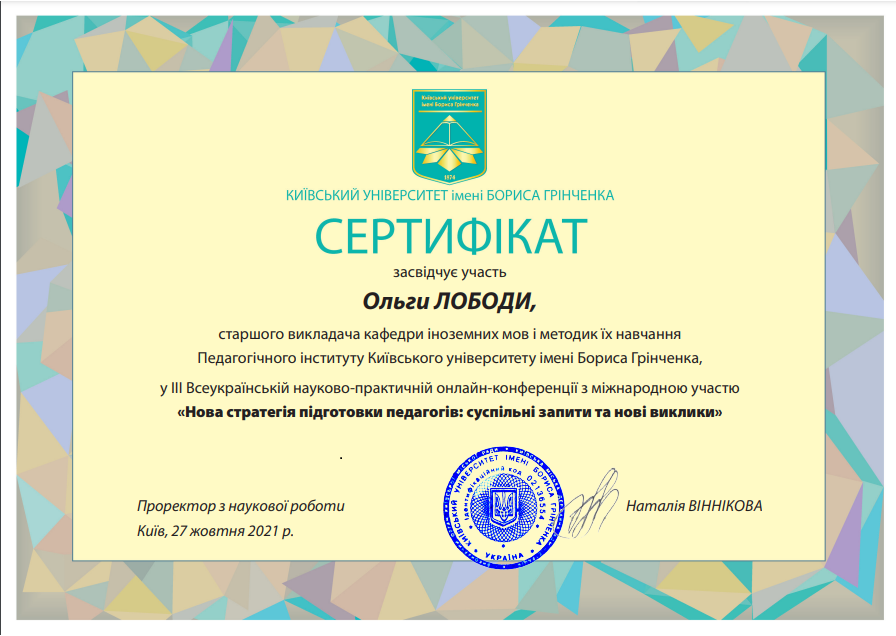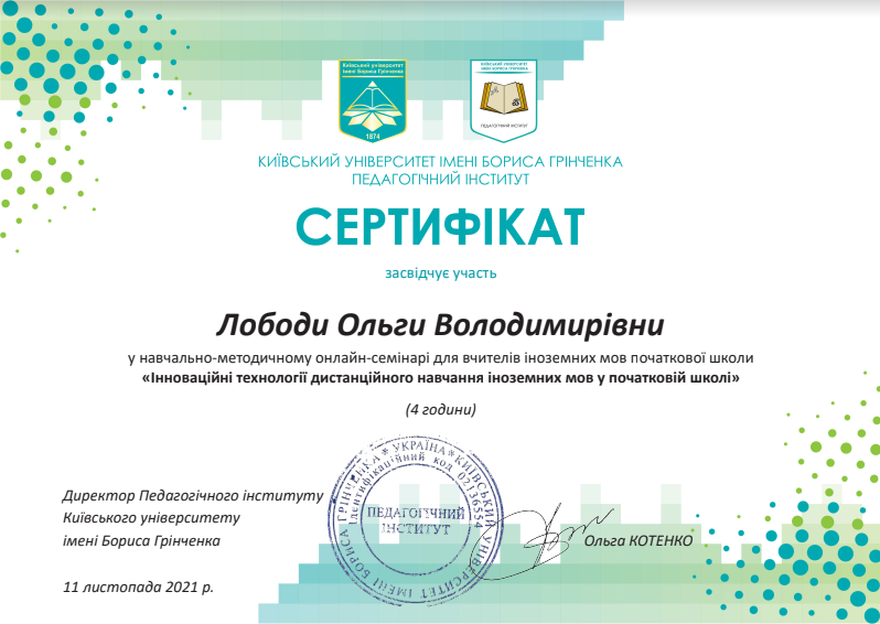 дошкільної педагогіки і психології, методист дошкільного виховання». Член мінародної організації IATEFL (International Association of Teachers of English as a Foreign Language).