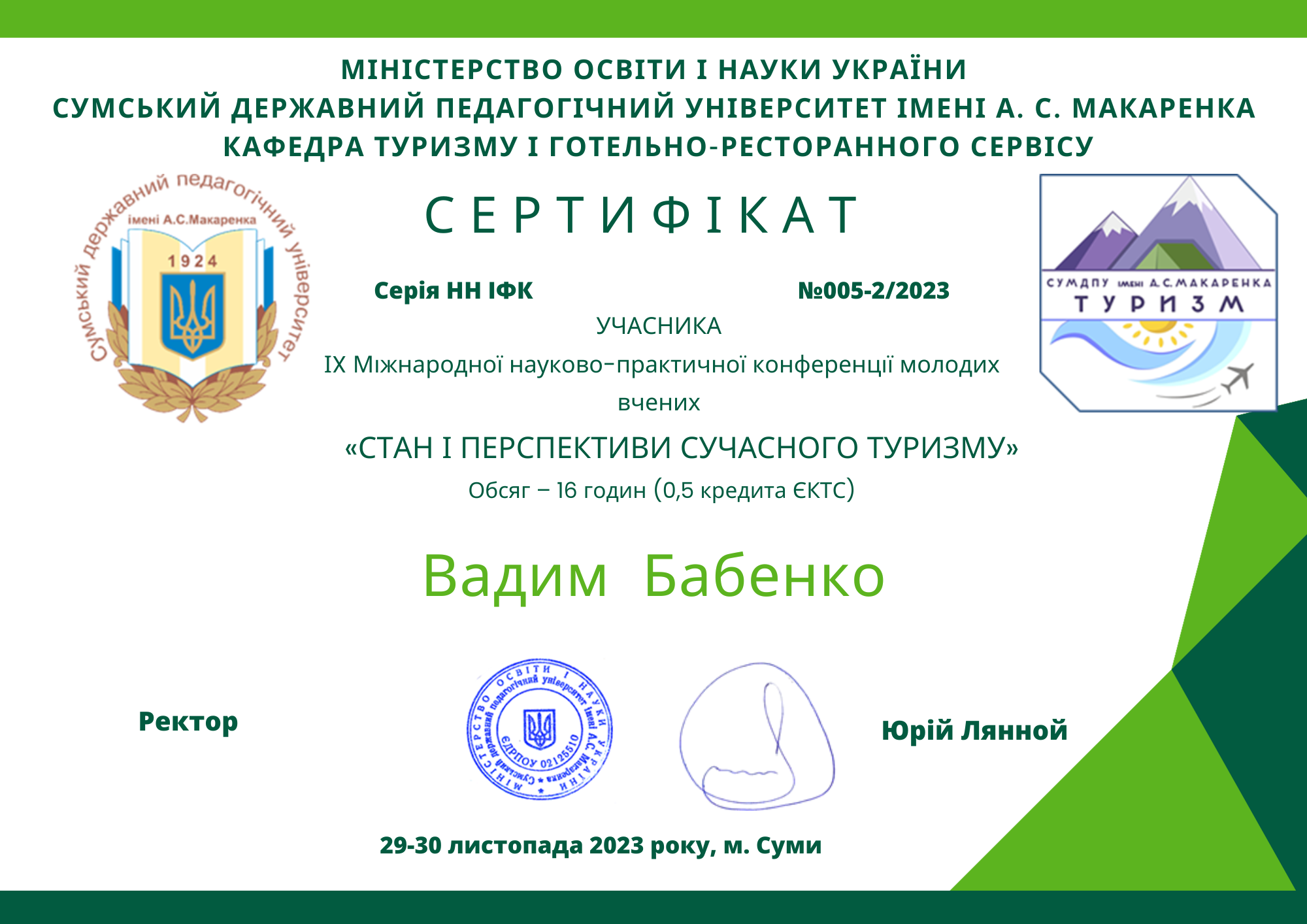 | 10094 | IX Міжнародна науково-практична конференція молодих вчених «Стан і перспективи сучасного туризму» | «Загальна особиста безпека забезпечення індивідуальних туристичних заходів» | Сумський державний педагогічний університет імені А.С. Макаренка |
