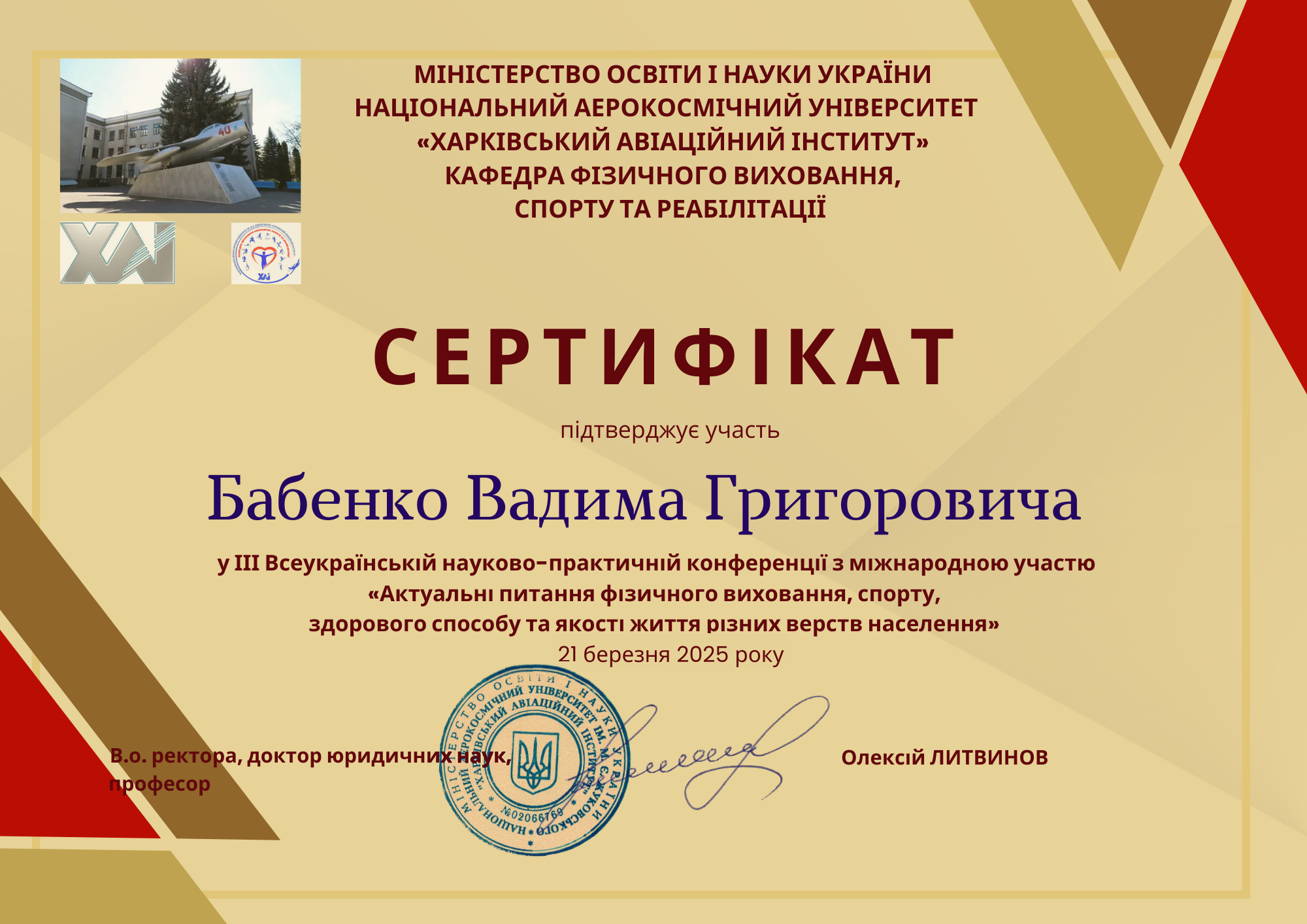 | 10340 | ІІ Всеукраїнська науково-практична конференція «Актуальні питання фізичного виховання, спорту, здорового способу та якості життя різних верств населення» | Дещо про фізичні вправи й рухову активність людей поважного віку. | Національний аерокосмічний університет імені М.Є. Жуковського «Харківський авіаційний інститут» | document.pdf | |