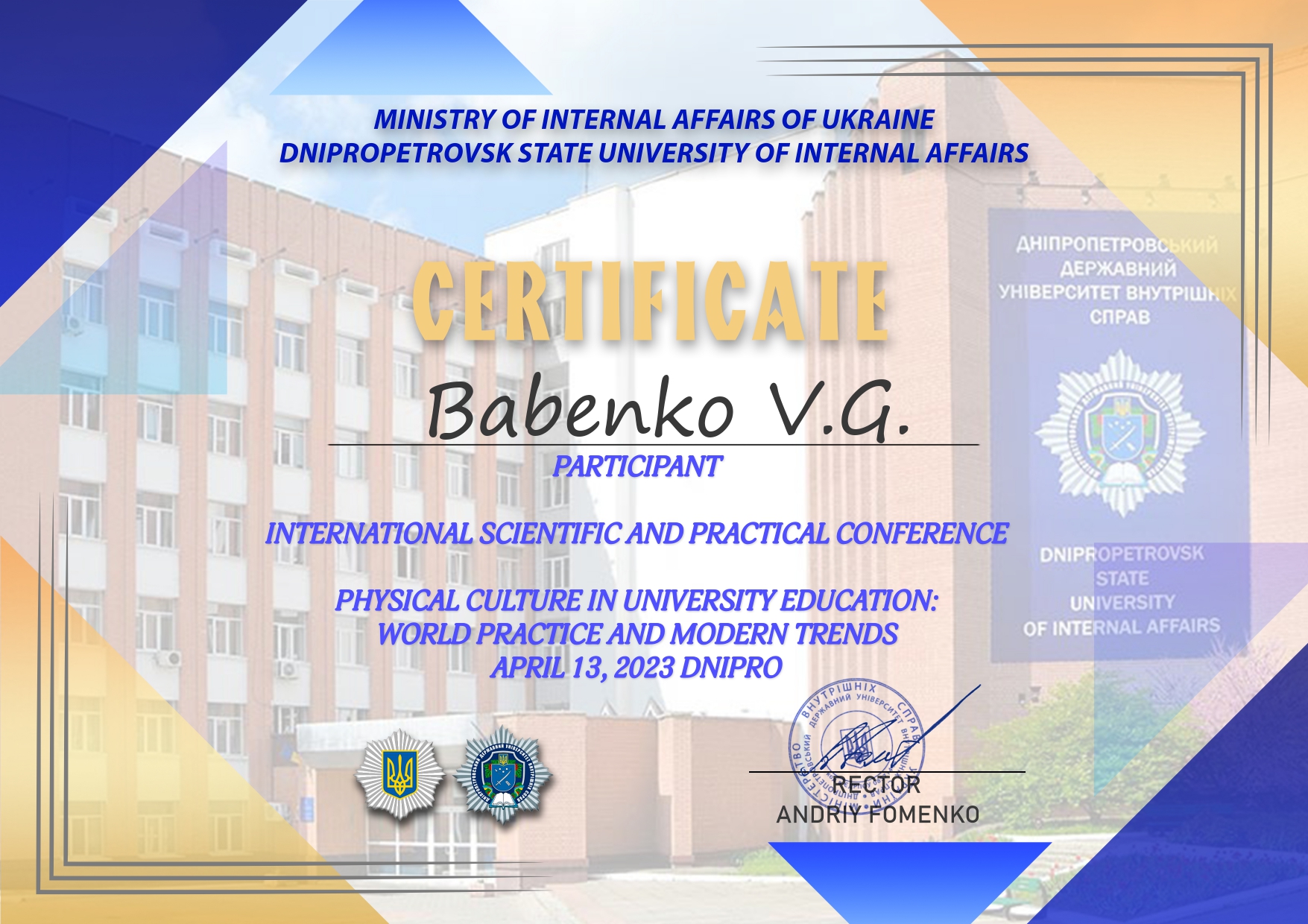 | 9201 | Міжнародна науково-практична конференція «Фізична культура в університетській освіті: світова практика та сучасні тренди». 13 квітня 2023 року, | Втома як результат загальноінтенсивного фізичного навантаження персоналу | Дніпропетровський державний університет внутрішніх справ, м. Дніпро. |