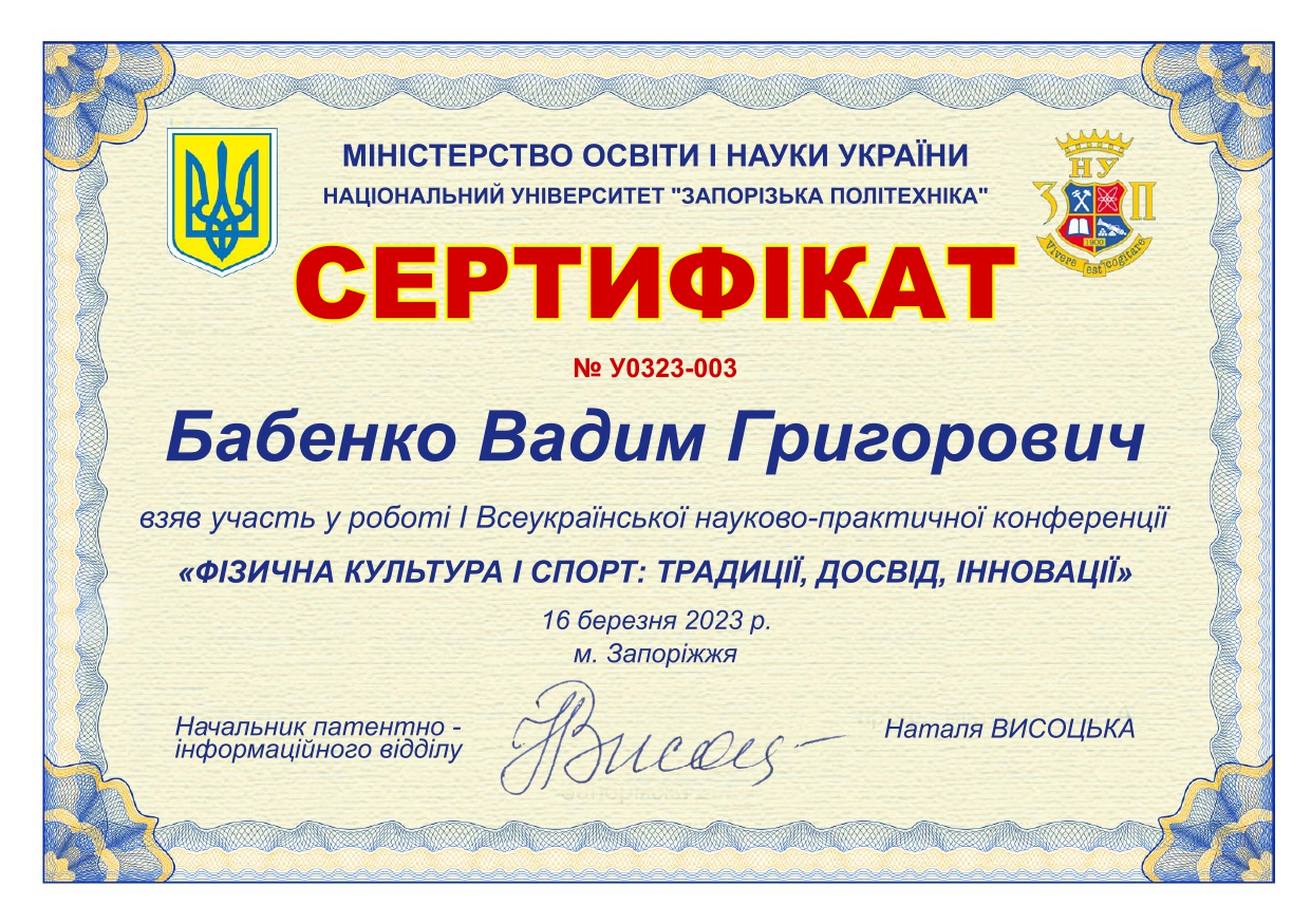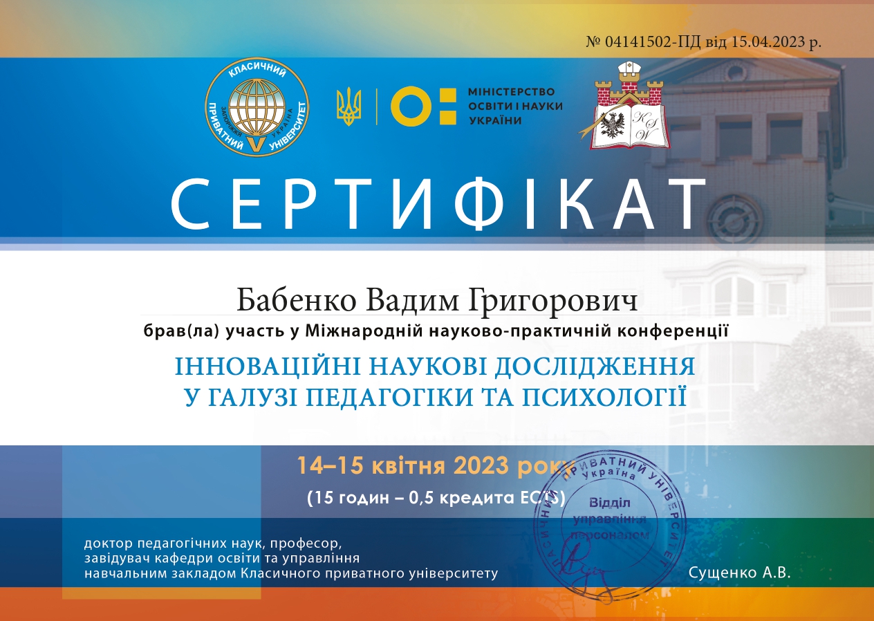 | 9461 | Міжнародна науково-практична конференція «Інноваційні наукові дослідження в галузі педагогіки та психології». | Менеджмент у повсякденній діяльності фізкультурно-спортивних колективів чи товариств. | Класичний приватний університет. м. Запоріжжя |