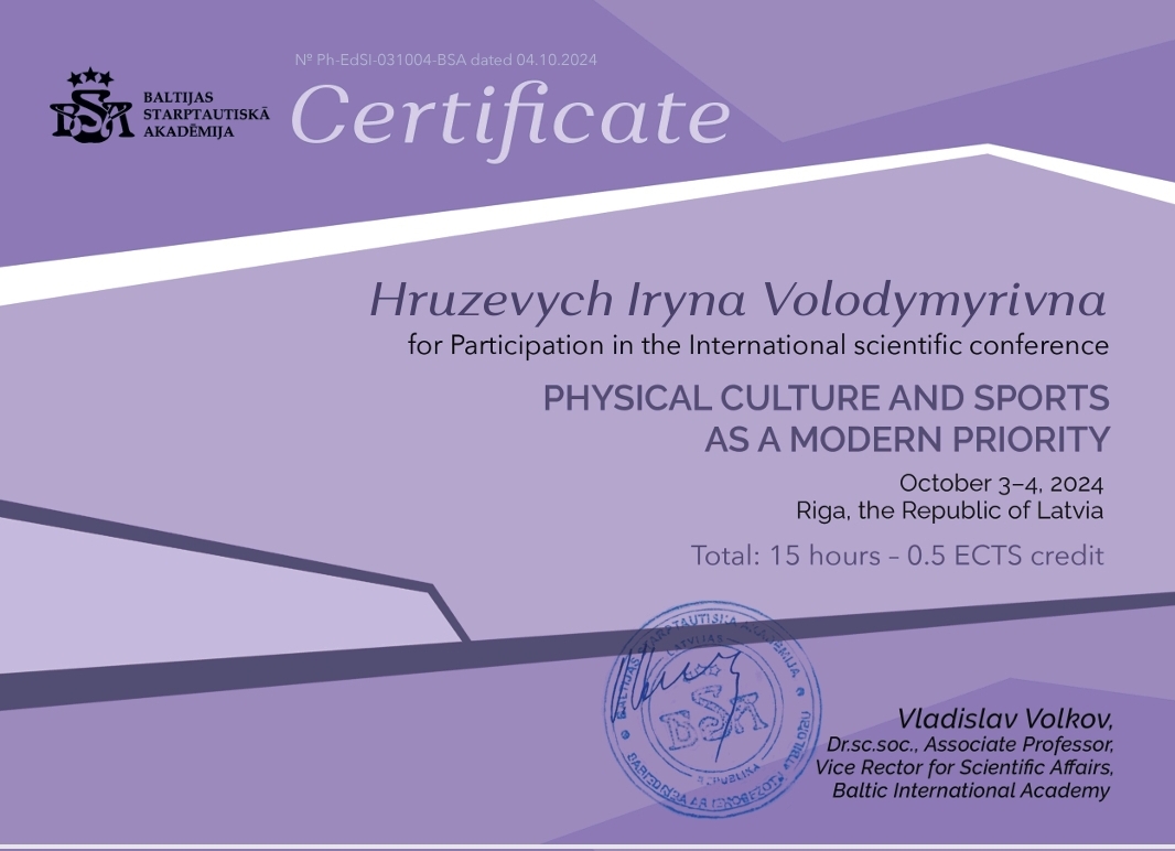 | 10849 | International scientific conference “Physical culture and sports as a modern priority” | NUTRITION OF STUDENTS OF THE SPECIALTY 017 “PHYSICAL CULTURE AND SPORTS” | Riga, Latvia |