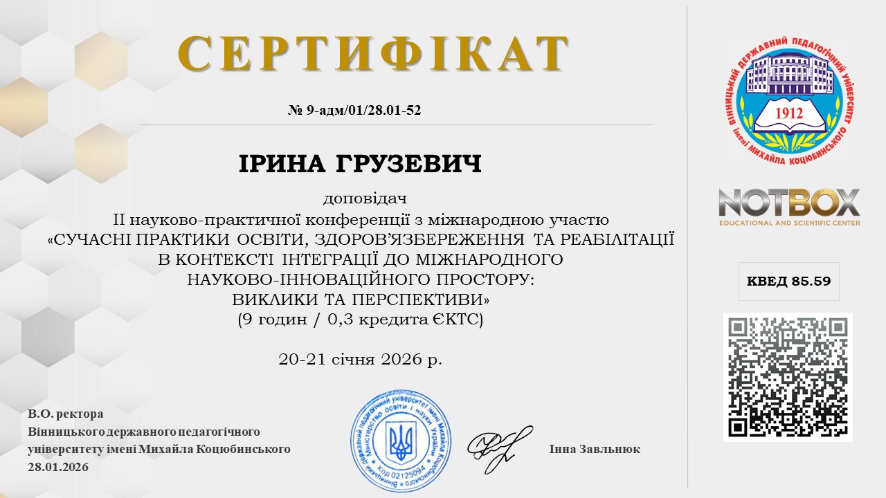 | 13064 | ІІ науково-практична конференція з міжнародною участю «Сучасні практики освіти, здоров’язбереження та реабілітації в контексті інтеграції до міжнародного науково-інноваційного простору: виклики та перспективи» | Формування здоровязбережувальної поведінки осіб середнього віку в умовах воєнного стану | Вінниця |