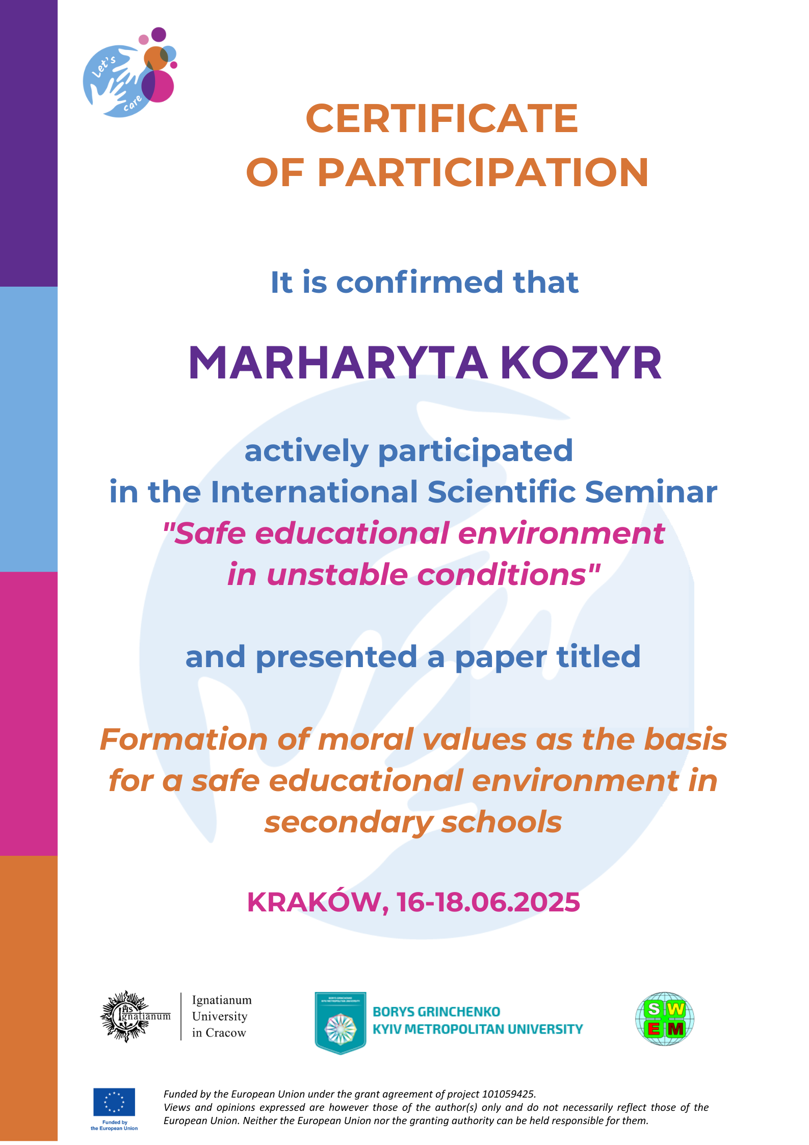 | 12047 | International Scientific Seminar \ | «Формування моральних цінностей як основа створення безпечного освітнього середовища в закладах загальної середньої освіти» | Польща |