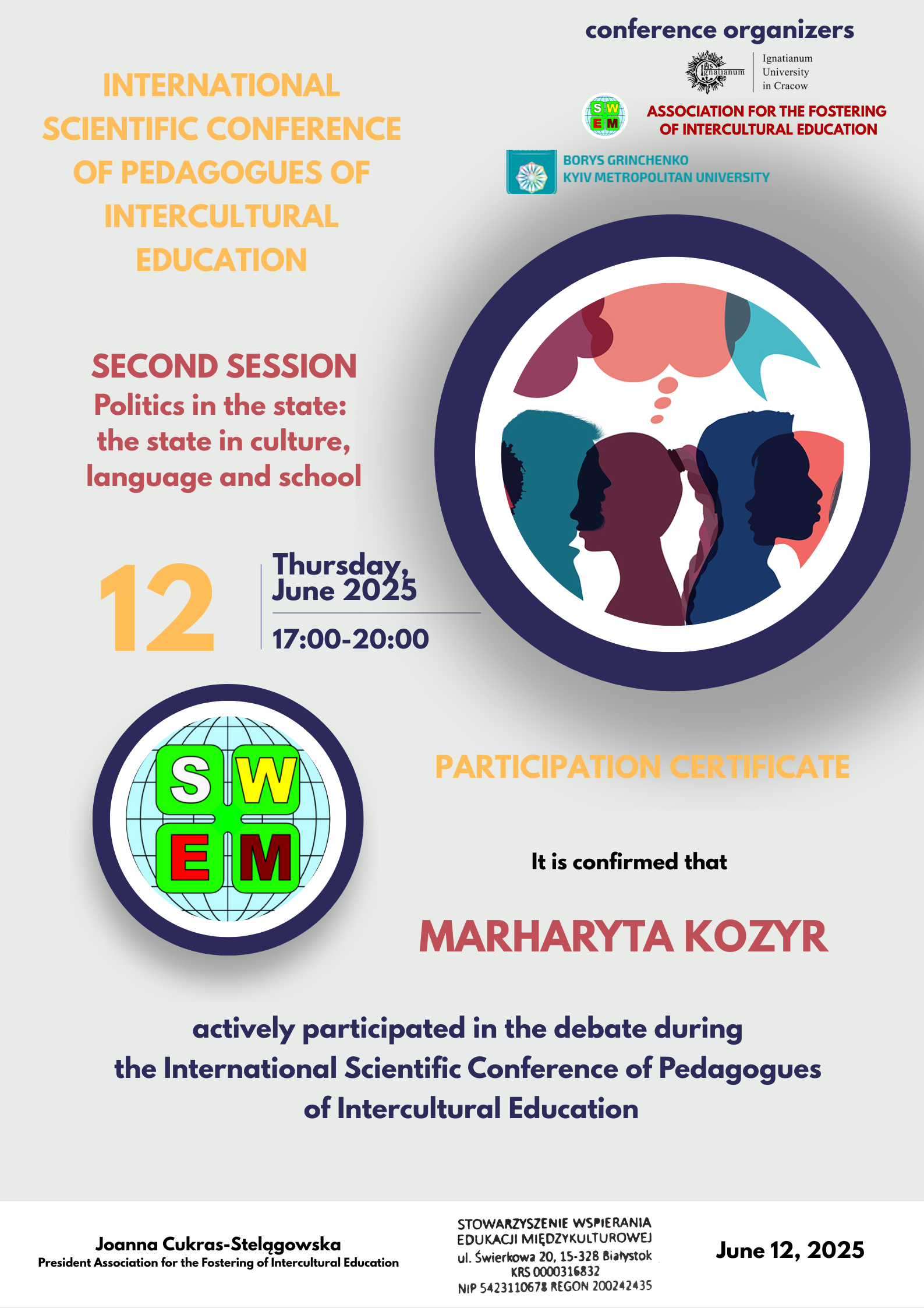 | 12048 | International scientific conference of pegagogues of intercultural educations | - | Польща |