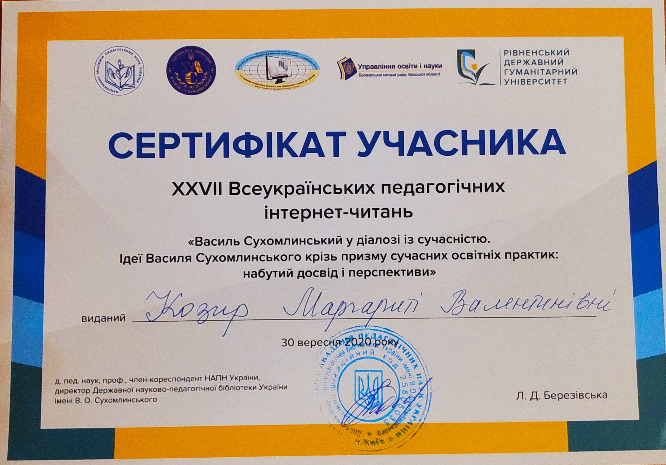 | 5519 | «Василь Сухомлинський у діалозі із сучасністю. Ідеї Василя Сухомлинського крізь призму сучасних освітніх практик: набутий досвід і перспективи» | Eмоційний інтeлeкт: потенційний вектор розвитку майбутніх філологів (на матeріалі літературної спадщини В.О. Сухомлинського) | ДНПБ України імені В.О. Сухомлинського |
